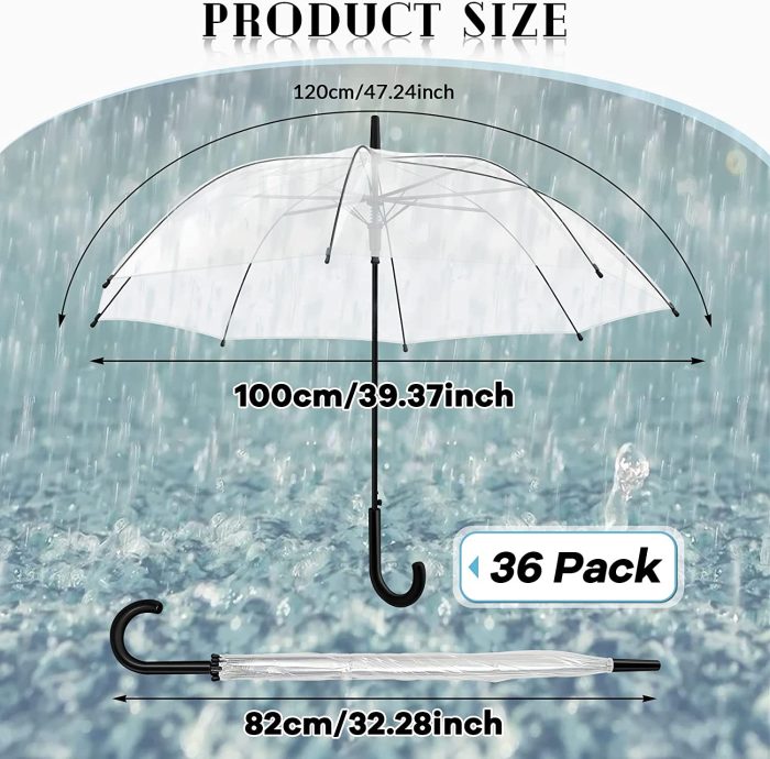 Pack of 36: the package includes 36 pack clear umbrellas which have individually packaged; These wedding style stick umbrellas can Serve well you from rain wind and snow; They can be ideal accessories for weddings while good for daily use which not only makes them easy to watch the outdoors but also looks more stylish they are good for weddings birthdays various ceremonies and daily use