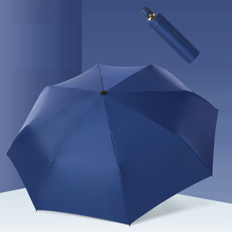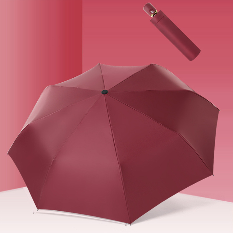 Automatic Solid Color Three Fold Umbrella Three fold umbrellas features:Fabric: pongeeType of umbrella: folding umbrella, fold umbrellaNumber of ribs: 8Umbrella ribs material: fiberglassWeight: about 330gPrint LOGO: YesOpen method: autoClose method: auto