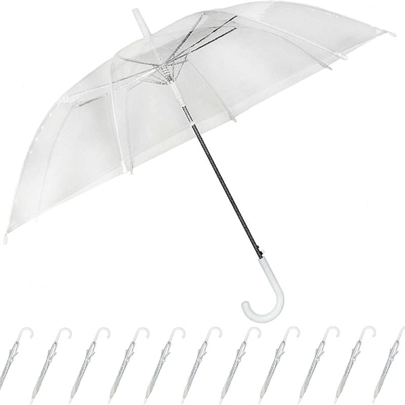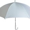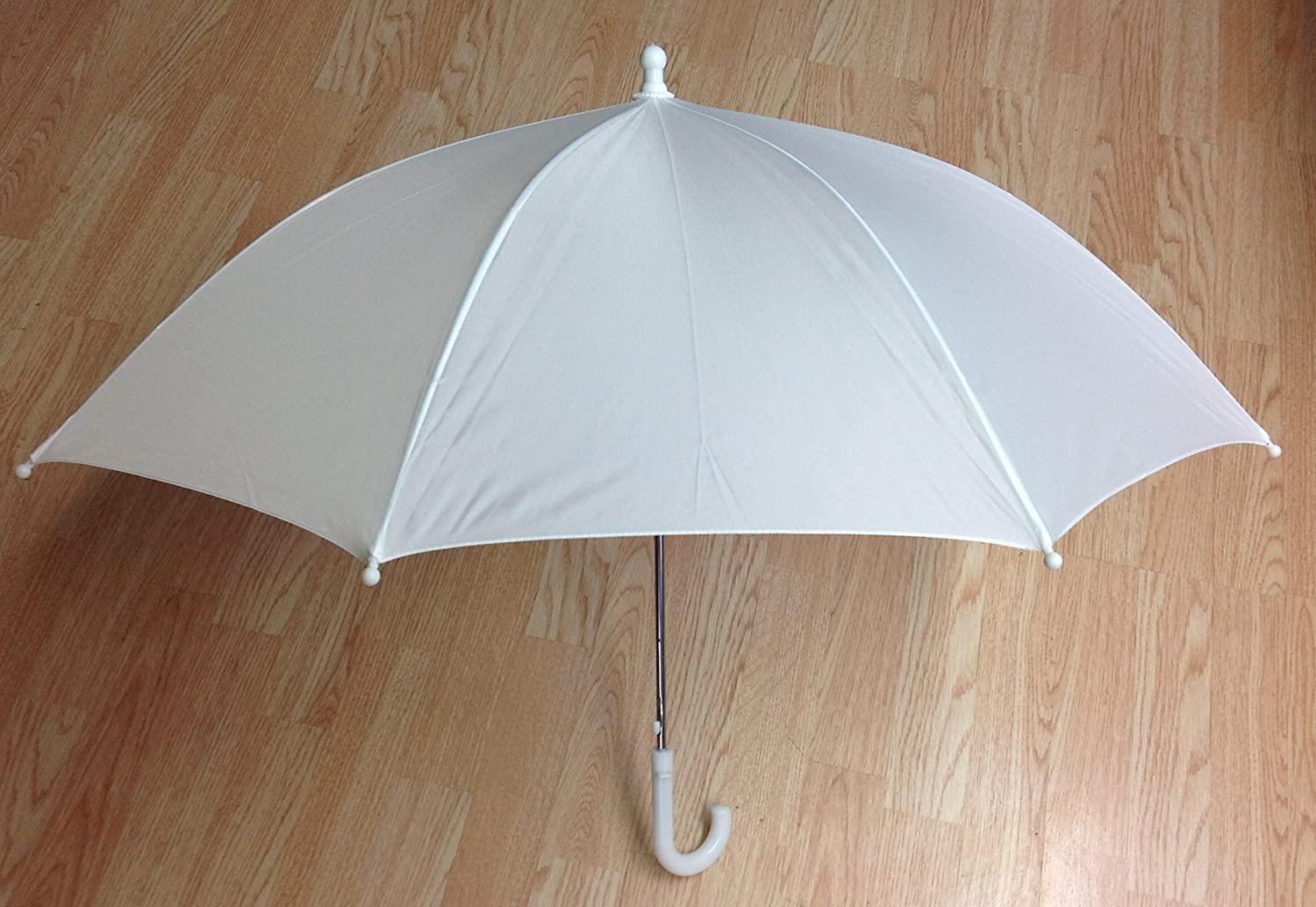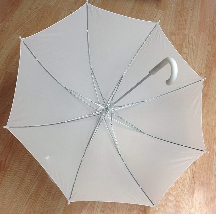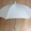 Bridal Shower Wedding White Nylon Umbrella Parasol 26 opening Waterproof the total length is 20 inches and the handle is white plastic hooked the distance over the top (the arc) of the umbrella is 32″