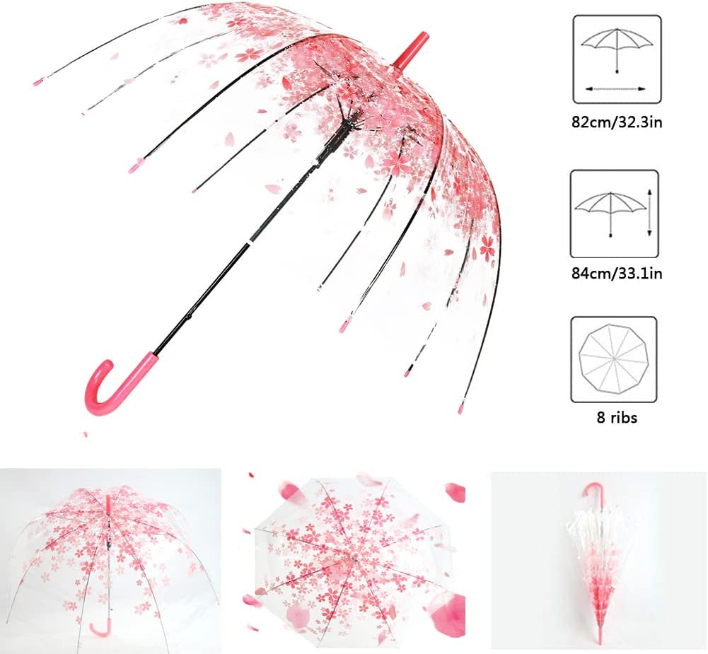 TRANSPARENT BUBBLE DOME UMBRELLA -The Clear cherry blossom design allows you to keep an eye on your surroundings while protecting yourself and kids from rain gusting and wind.Feel the rain drops much closer and pink umbrella goes with any of your outfit.kid’s bubble dome umbrella with extended canopy keeps you and the kid one dry.