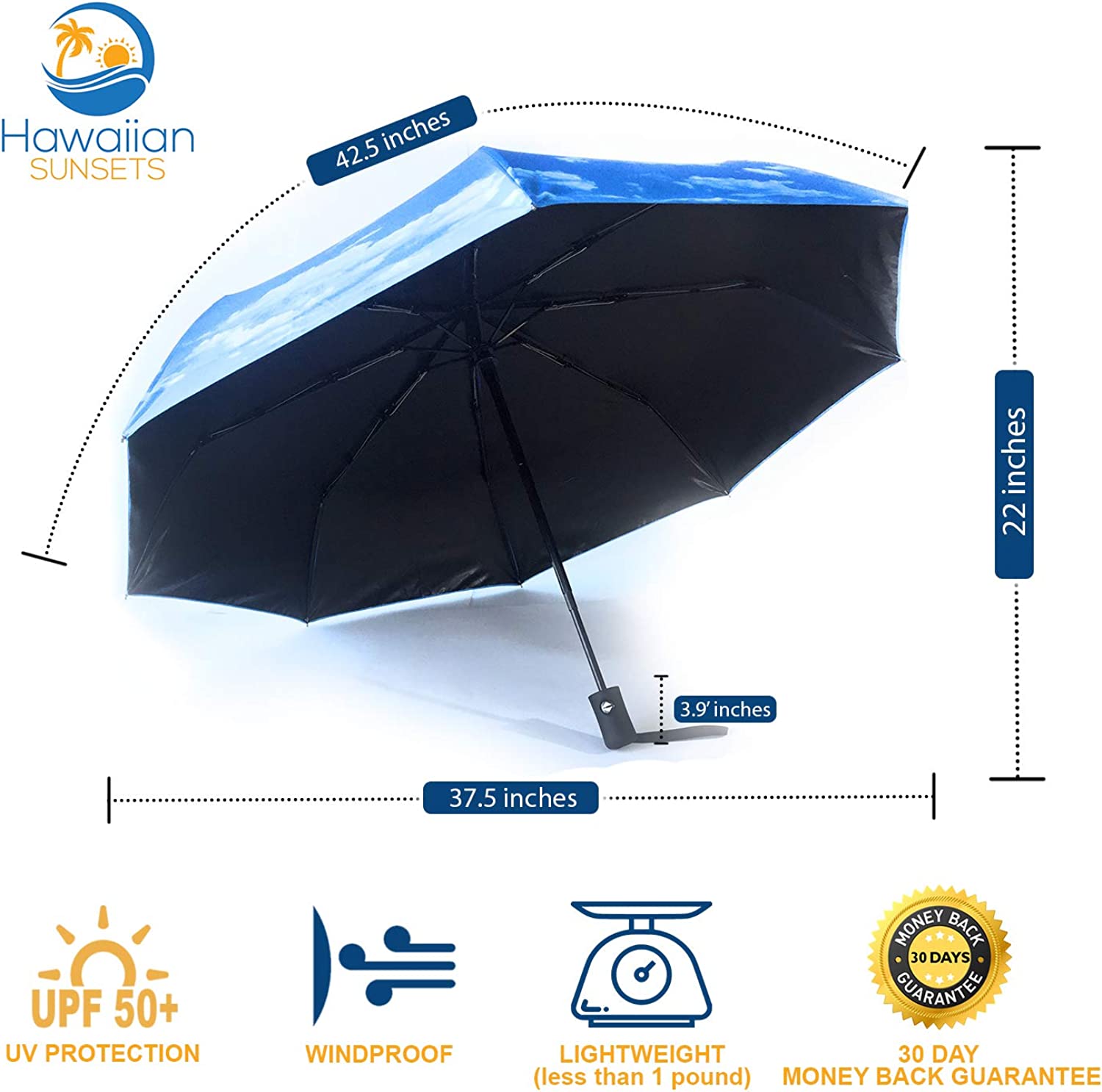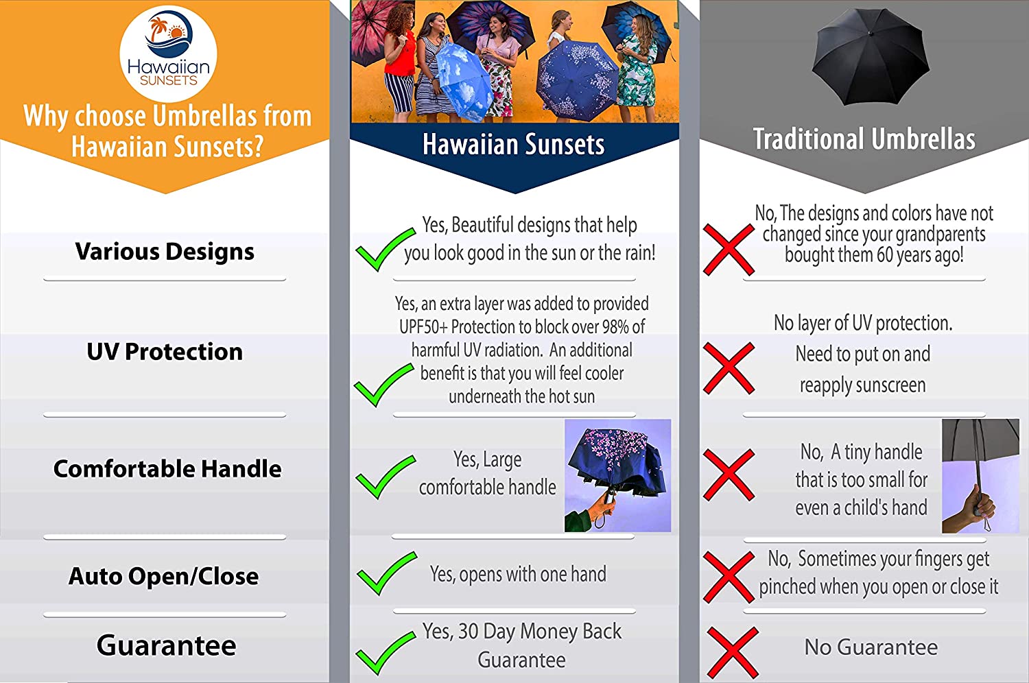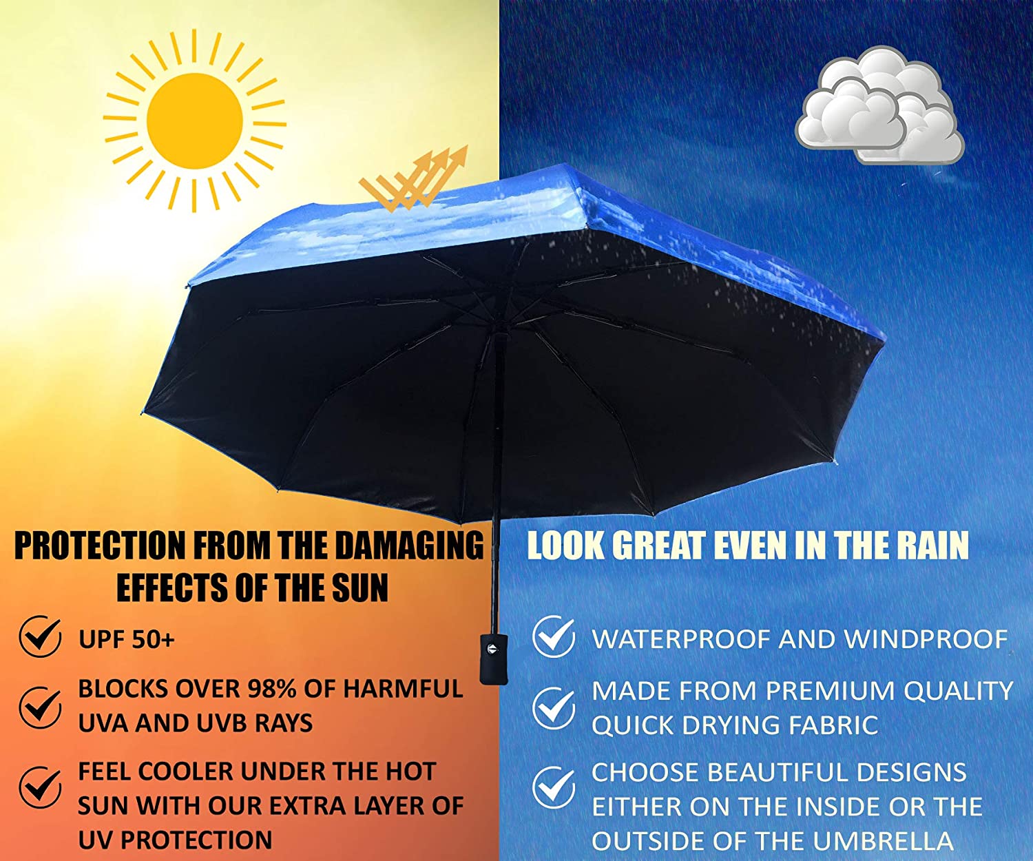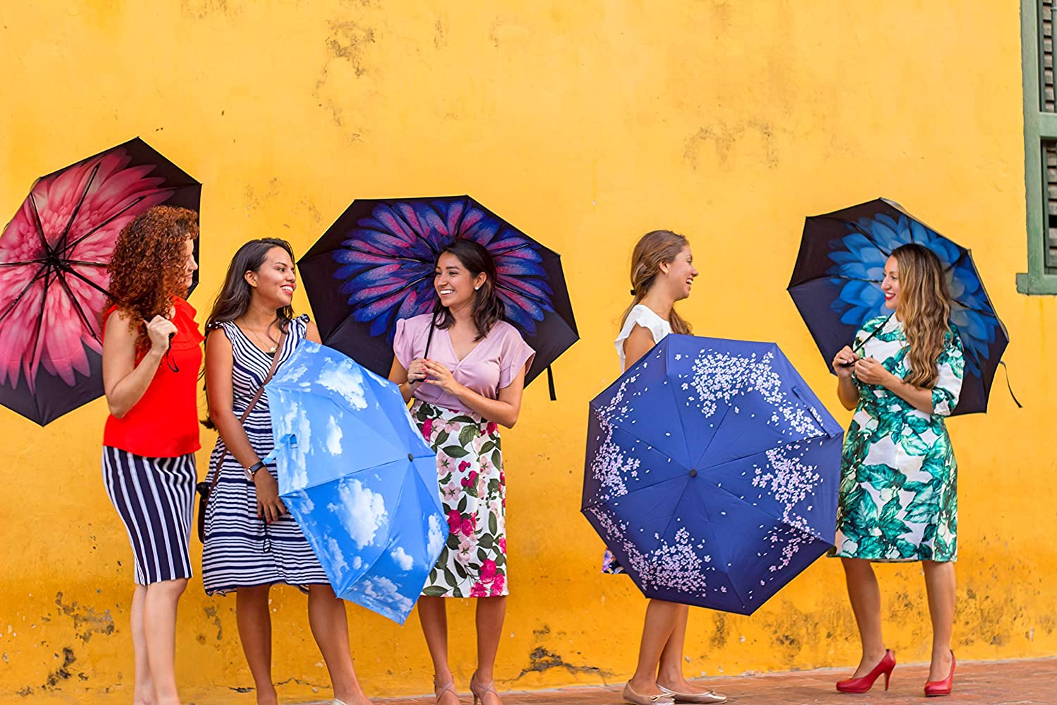 SUN UMBRELLA UV PROTECTION are rain umbrellas with UPF 50+ protection. Unlike an umbrella inverted or an inside out umbrella these rain umbrellas for rain women love blocks 98% of UV rays and protects you from both harmful UVA & UVB radiation to prevent premature aging of your skin. Use this portable umbrella together with sun protection clothing women crave.