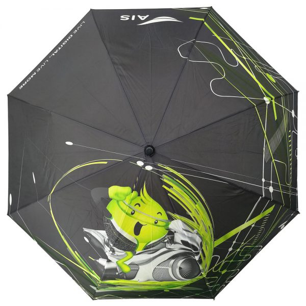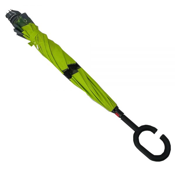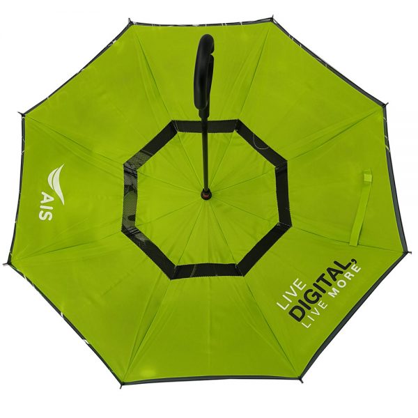 Custom Personalized Design Branded Logo Print on Upside Umbrella Outer Layer and Inner Layer. C Shape Handle, Fiberglass Frame, Low Quantity Order Acceptable.