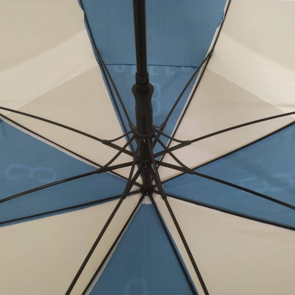 Custom Golf Umbrellas No Minimum, MOQ:1PCS. Double Vented Layer. Plastic Handle with Strong Frame 14.0 Fiberglass Shaft (Pole), 5.0 Short Ribs 4.0 Long Ribs.