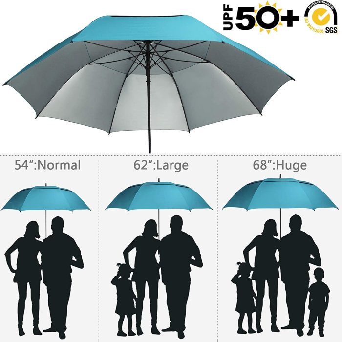 Practical Golf Umbrella: 54 62 68 inch arc 45 52 59 inch in diameter respectively is big enough to provide protection for 1 to 4 people the perfect companion for a family outdoors activities; umbrella stands 43.3inch and comes with a matching sleeve for convenient storage.