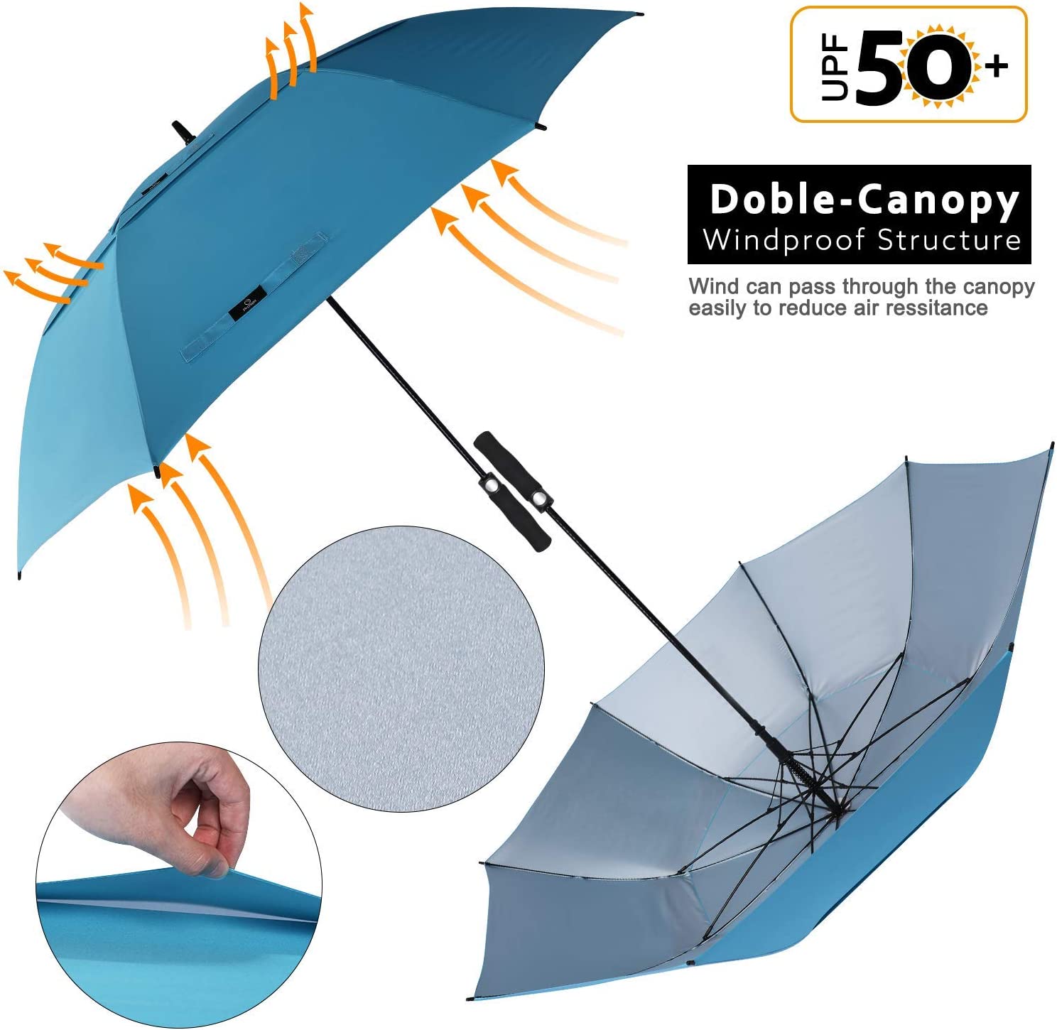 ? UV & RAIN PROTECTION GOLF UMBRELLA: Silver coating inside isolates UV and reflects heat to cool you down UPF 50+ for high protection from sunrays (blocks 99.95% of sunrays). 210T ultra-high density pongee fabric is water repellent and quick to dry protecting you from a heavy downpour.