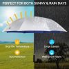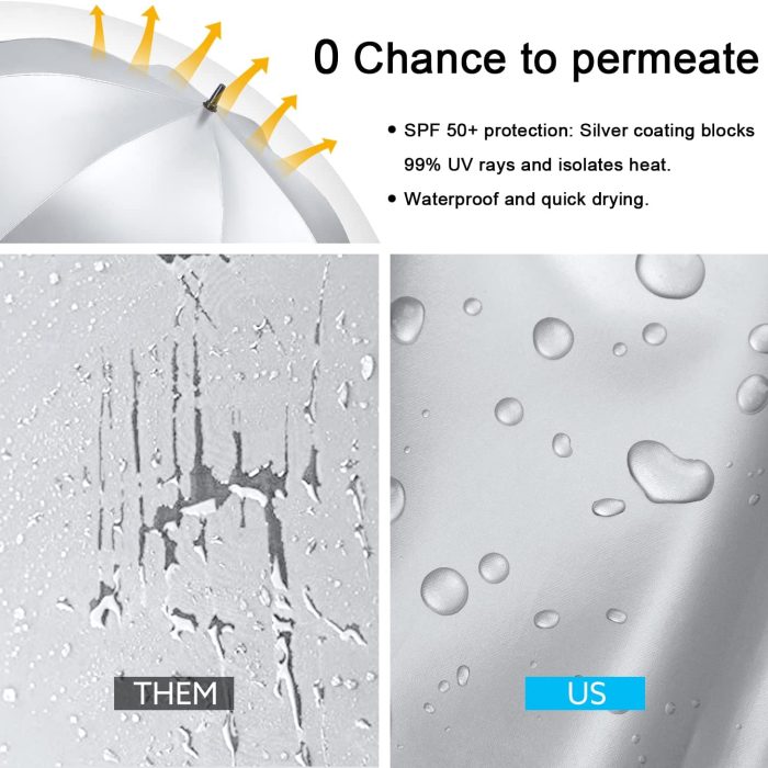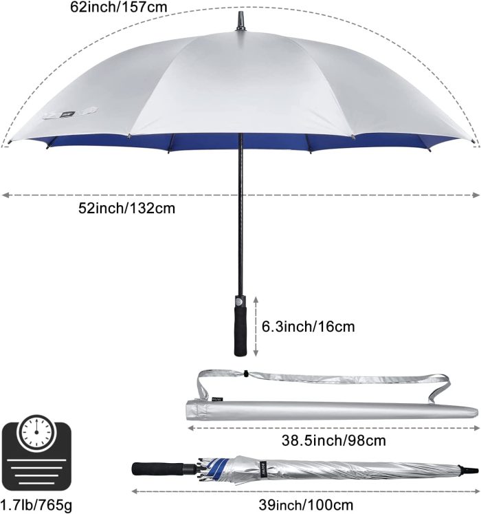 UPF 50+ UV Protection Umbrella. Titanium silver coating fabric reflects heat to lower the temperature under the umbrella 50+ UPF rating blocks 99% of the sun’s harmful UVA and UVB. This UV golf umbrella protects your skin and keeps you cool in hot the sun.