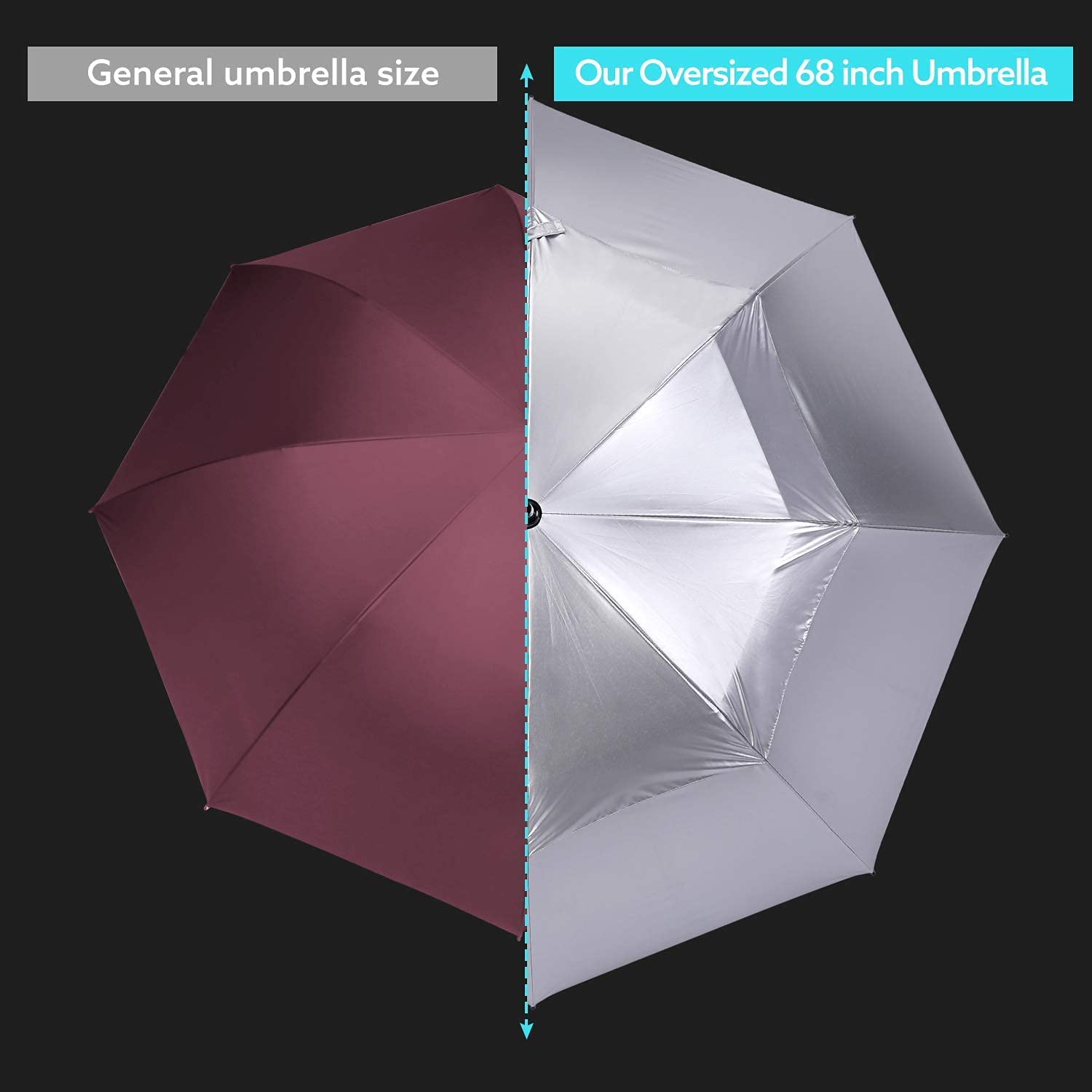【Pinchless Auto Open】The silver oversized golf umbrella has a 68-inch arc and 59-inch diameter canopy. It is big to hold 4 people standing tightly underneath. Simply press the button on the EVA handle. Auto opens in one second. Ensures no delay and gives timely protection from sun or rain.