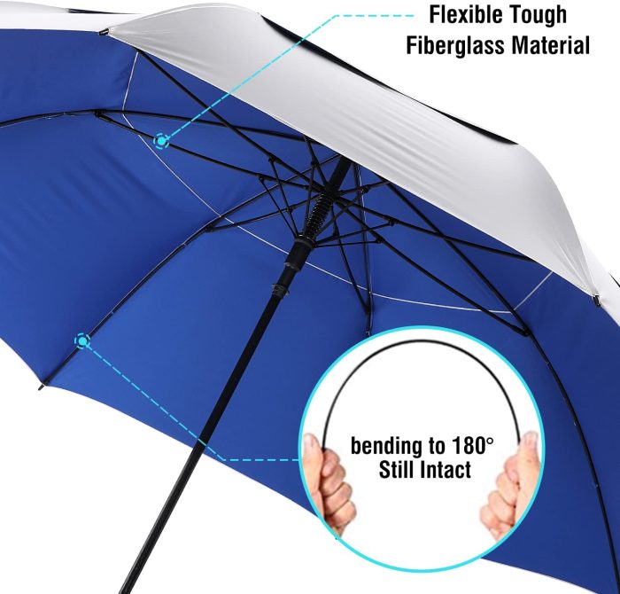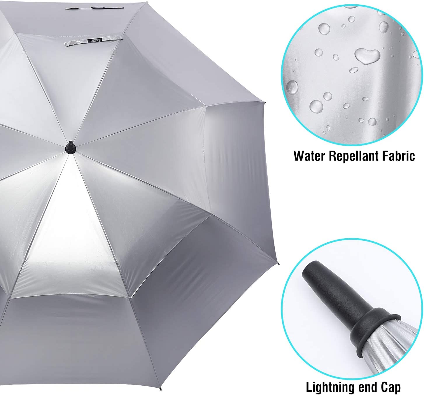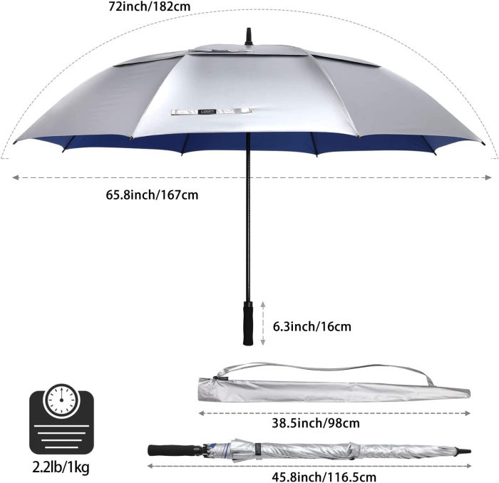 72 Inch Huge Umbrella. This is an extra-large oversized golf umbrella with an arc canopy of 72 inches and a diameter of 65.8 inches. Cover shade large enough for at least 4-6 people. A heavy-duty men’s umbrella with a 45.8-inch longer umbrella shaft than other umbrellas. Great for family outdoor golf course compatible for golf cart.