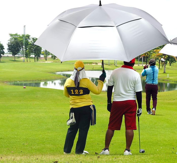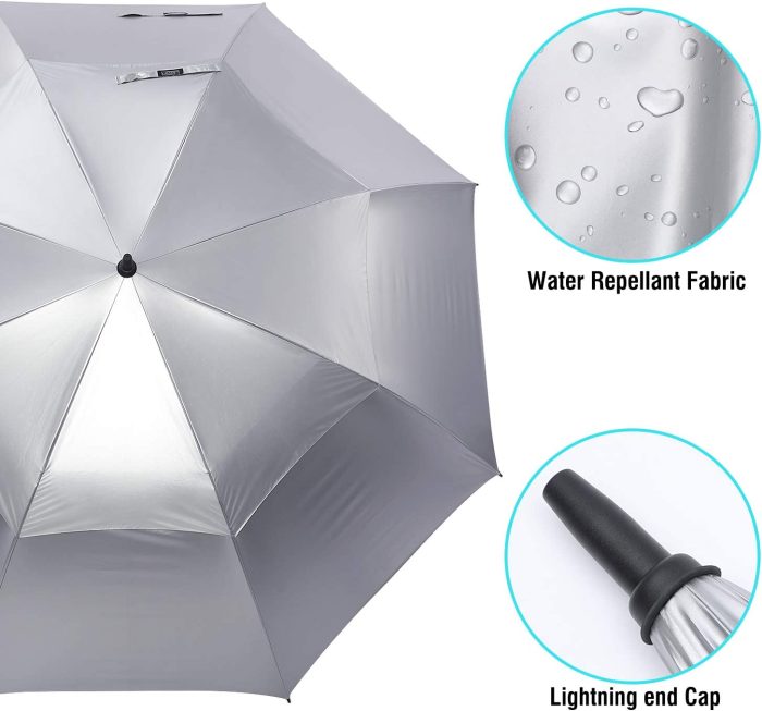 This UV golf umbrella reflects the light and blocks out 99% of UV rays. The silver-coated fabric offers a UPF 50+ protection away from harmful rays.