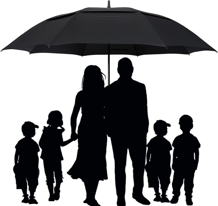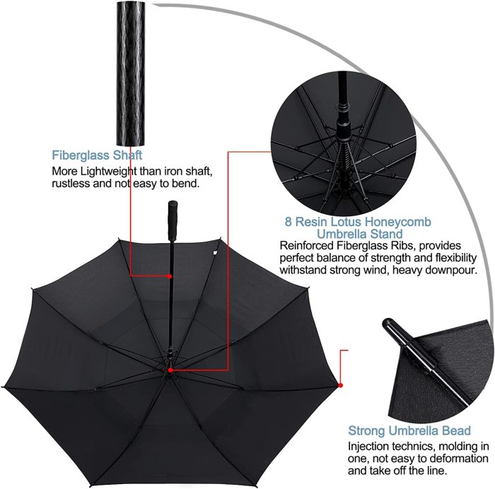 [72inch huge golf umbrellas] The oversized umbrella has a 72-inch arc and a 65-inch diameter. Bigger than 62 inch/68inch normal umbrella amazing coverage. This giant umbrella can shelter 4~6 people standing tightly together. Perfect for a 6′ tall man a single couple a family of 4 or two men and two ladies keep you pretty dry.
