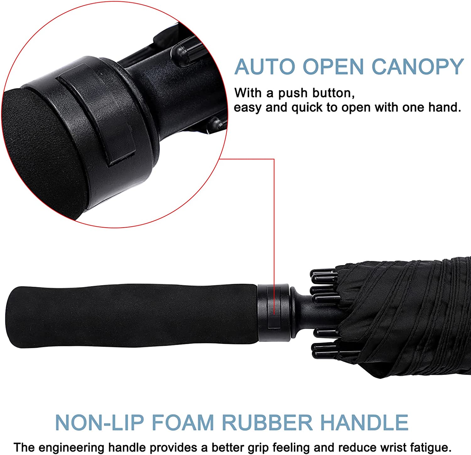 [Auto open in one second] OPENS FAST Automatic Open functionality ensures that there will be no delay to your comfort. Simply press the button on the handle to open. Double tie-down straps that wrap the large umbrella closed tightly. Carry a sleeve with straps convenient to store.