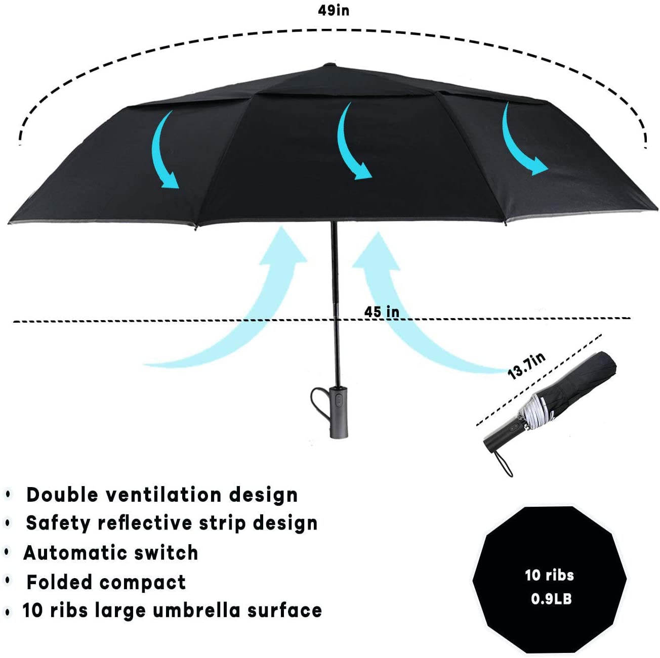 ?Upgraded 10 Ribs Double Vented WINDPROOF Umbrella: Our black umbrella features 10 resin reinforced fiberglass ribs that withstand the strongest gusts of wind and are designed to give not break preserving your umbrella should you face extreme conditions. The canopy on our small umbrella is double vented which lets wind pass through while keeping you dry.