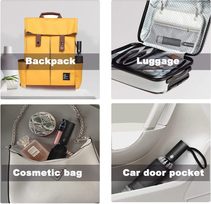 2.?AUTOMATIC OPEN & CLOSE Travel Umbrella: Auto open/close function is easy to use. At 13.7 inches (35 cm) when closed our lightweight umbrella (15 ounces) is easy to store in purses briefcases backpacks luggage and more.