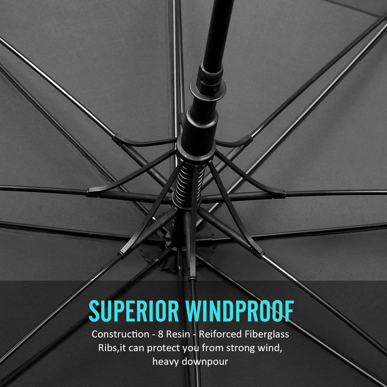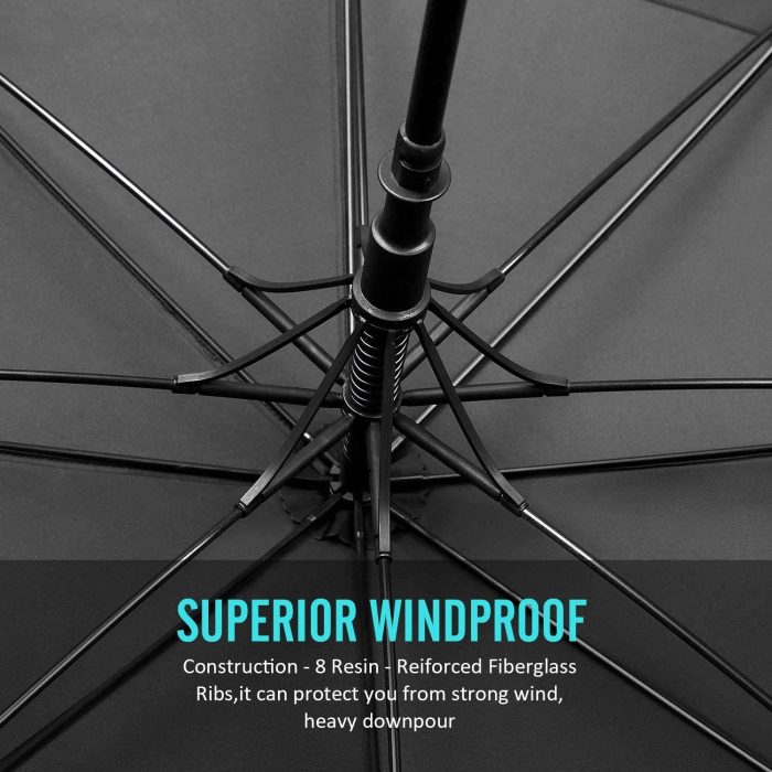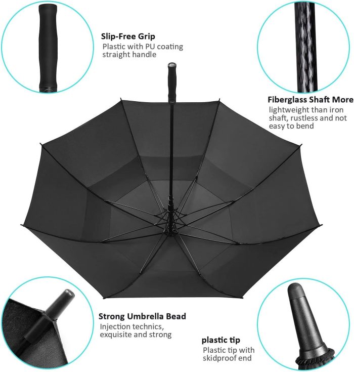 FIGHTS THE STORMY WEATHER: The vented double-canopy design adds strength and flexibility. The solid framework underneath flexes with the wind so that the umbrella keeps its shape The fiberglass ribs hub and shaft do no conduct electricity so you can safely use this umbrella in stormy weather throughout the course.