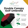 LARGE GOLF UMBRELLA: Heavy duty golf umbrella with 60 inch arc is ideal for rain and sun protection and features a strong windproof fiberglass frame with durable water resistant polyester; this oversized stick umbrella is created to repel even the hardest rainfall and the strongest of winds; umbrella features a double canopy for improved wind resistance and a sure-grip rubberized handle