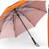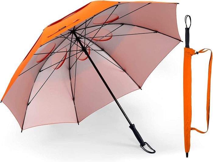 Storm Proof: This umbrella has been tested resist up to 55 mph strong wind the umbrella made use sturdy fiberglass ribs and resinforcing structure ribs Double canopy and with 8 air vents where wind can pass through Strong wind resistance when you use umbrella in rainstorm weather.