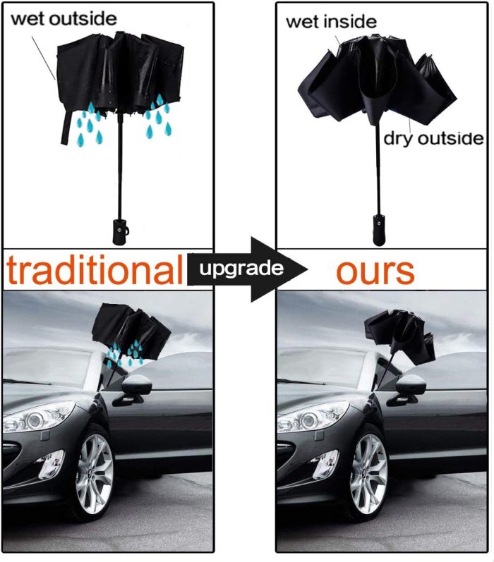 UNIQUE REVERSE FOLDING DESIGN – Are you still upset about getting wet when you step into the car in the heavy rain even if you are using your umbrella?Now we have the best solution:INVERTED FOLDING UMBRELLA! This reverse umbrella fold the wet inside and the dry outside when you step into your car or store or wherever which prevents water from dripping keeping floors and cars dry.