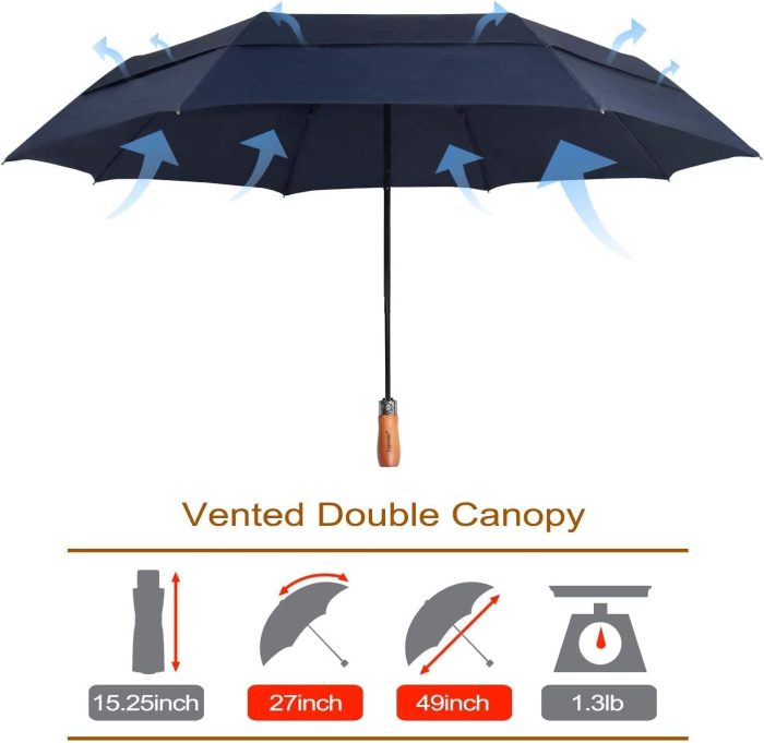 Water Repellent Fabric & Luxury Real Wooden Handle: This large umbrella is made of 210T fabric with a specialized Dupont Teflon coating making it water repellant and fast-drying. Also the ergonomic real wood handle with finger-notches makes it comfortable to hold and easy to grip.A perfect windproof golf/travel/business umbrella for you.