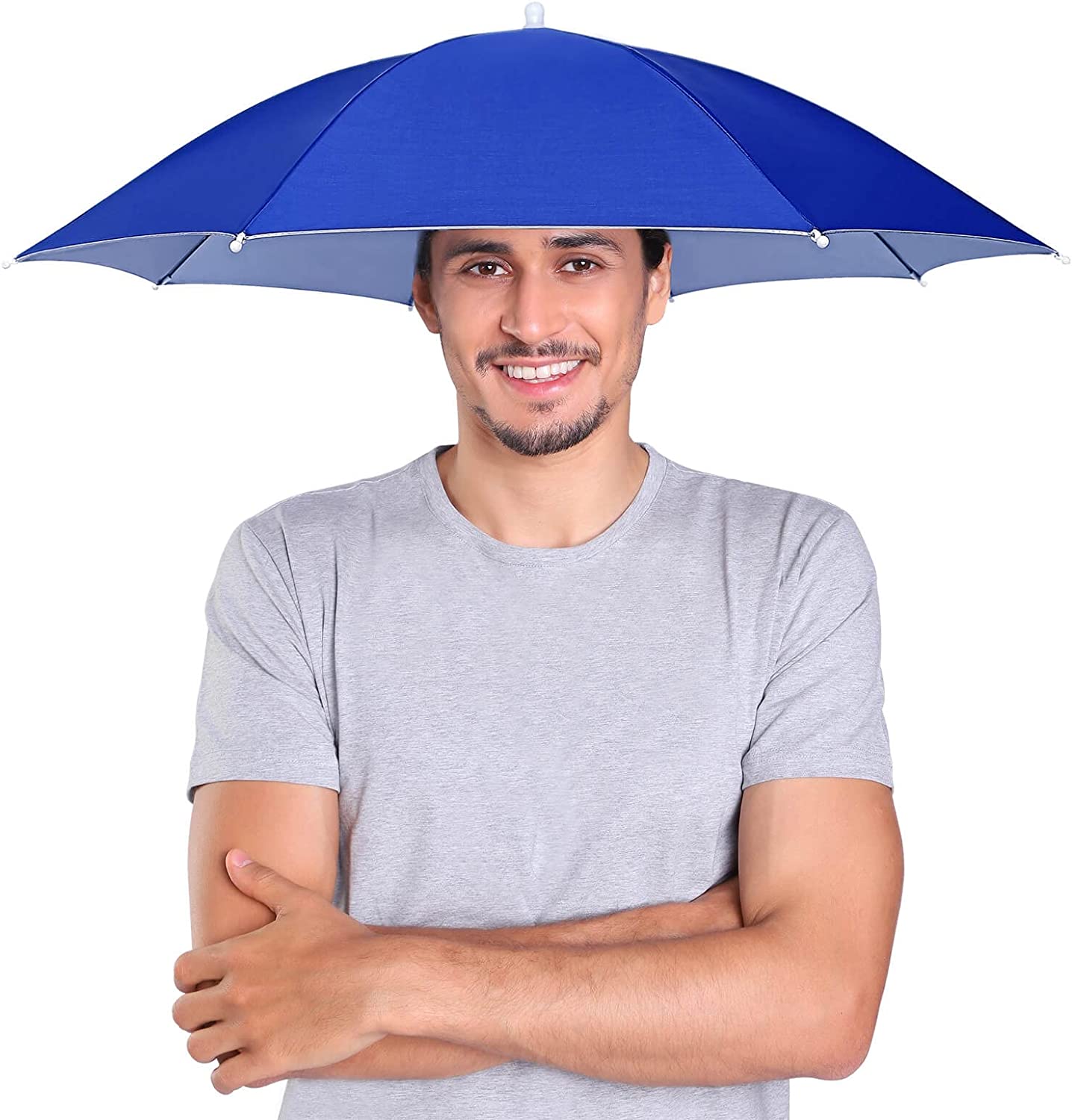 MATERIAL/SIZE:Silver Plasters metal plastic. Open 27 inches in diameter 16.3 inches long when folded. Weight about 100 g.The outside is blue the inside is silver. 8 metal ribs makes umbrella very strong.Grab your Umbrella Hat and Have Some Fun in the Sun !