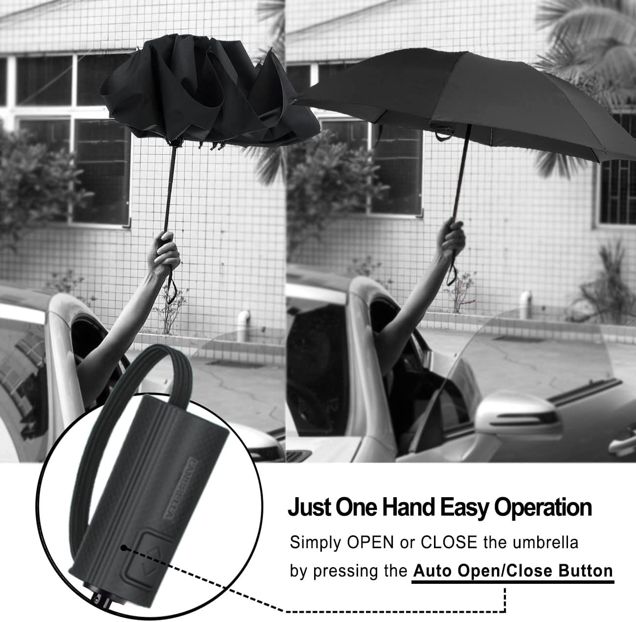 CONVENIENT AUTO OPEN/CLOSE IN ONE SECOND: Just push the button once to automatically open and press again to instantly fold the canopy closed. You do not need to wait another second to open the umbrella when you get out of your car in the rain especially in heavy rainfall even when your hands are full of things.
