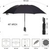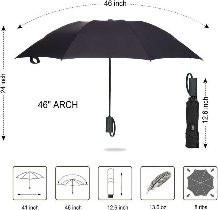 SUPERIOR WINDPROOF AND WATERPROOF: This windproof umbrella is flexiable enough to withstand powerful wind without turning inside out. It is fortified with 8 reinforced fiberglass ribs. The cannopy is made of high density 210T waterproof material which makes it good at waterproof function. Besides it is 46 inch arc you don’t have to choose between gigantic windproof umbrellas or tiny ones that cannot provide minimal wind protection.