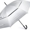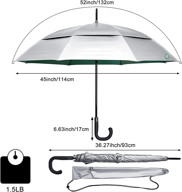 Classical J Hook Handle. Featuring a curved rubber J handle to grip comfortable and easy hangup this 52inch arc canopy with a 45inch in diameter stick umbrella keeps you elegant when you walking out hanging traveling and golfing. Never worry about flipping with a double-canopy design for optimum ventilation and stability.