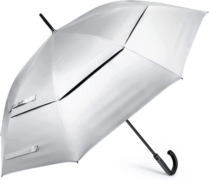 Strong Windproof Construction. The thick silver coating fabric is water repellent on rainy days. 8 fiberglass ribs provide great long-lasting performance without easy inverting. This long stick umbrella is windproof and the whole shaft is strong enough to protect you in hard weather.