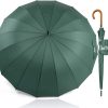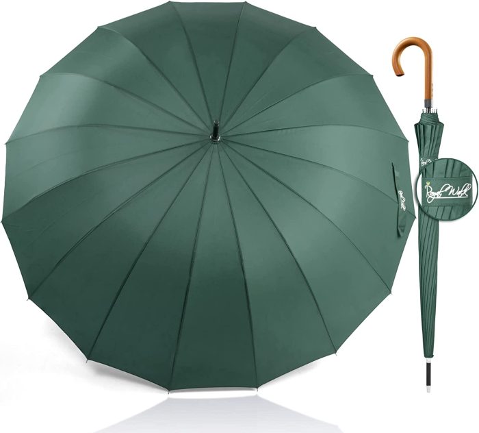 – It is featured by ULTRA STRONG WINDPROOF CONSTRUCTION supported by Black Aluminum Frame 16 fiberglass ribs and fancy comfortable wooden J-curved handle. This is a great windproof large umbrella perfect for travel golf and it is a perfect addition to your business outfit.