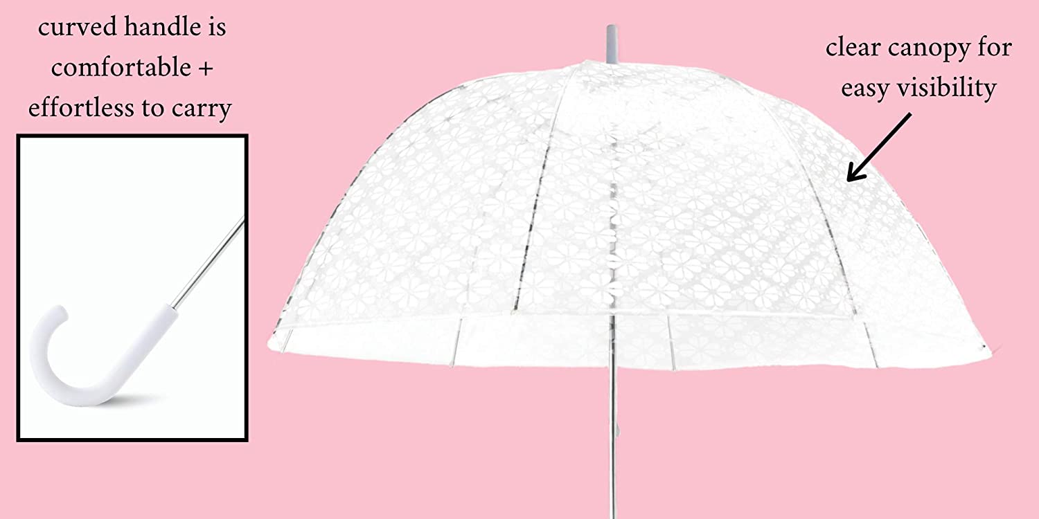Umbrella is made of clear plastic for easy visibility in weather with a curved handle for added comfort