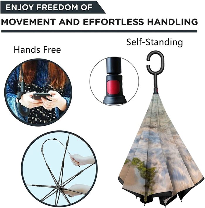 REVERSE DESIGN & KEEP DRY: Innovative reverse opening and closing design ensures the wet side of the canopy folds inward to keep you away from the water also prevents rainwater from dripping keeps floor room cars and clothes dry. Also this umbrella can self-standing never lean on a wall again and be convenient for you to place anywhere.