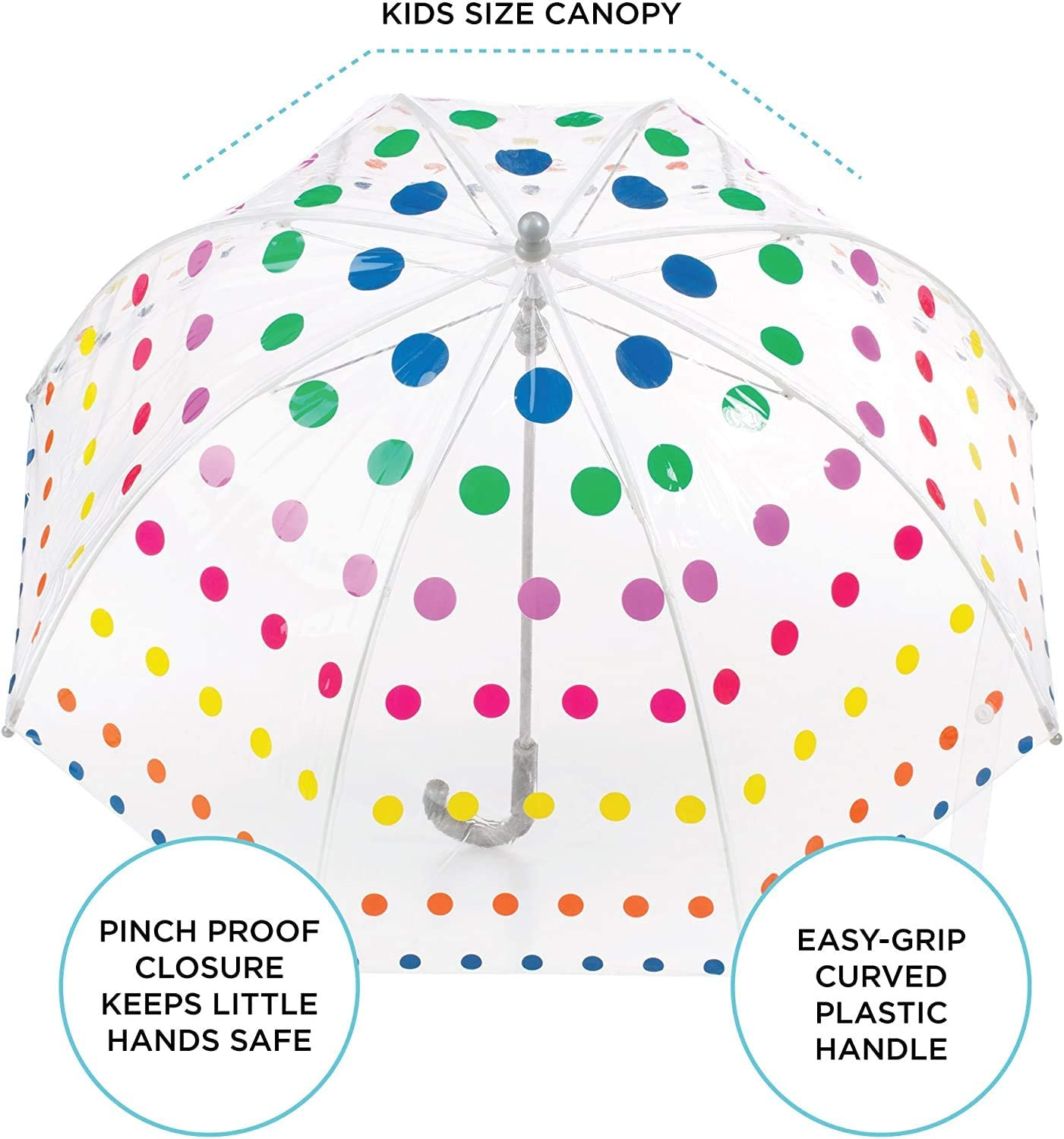 CLEAR UMBRELLA: The clear canopy with fun and unique designs ensures your child can always see what’s ahead while walking through the rain.