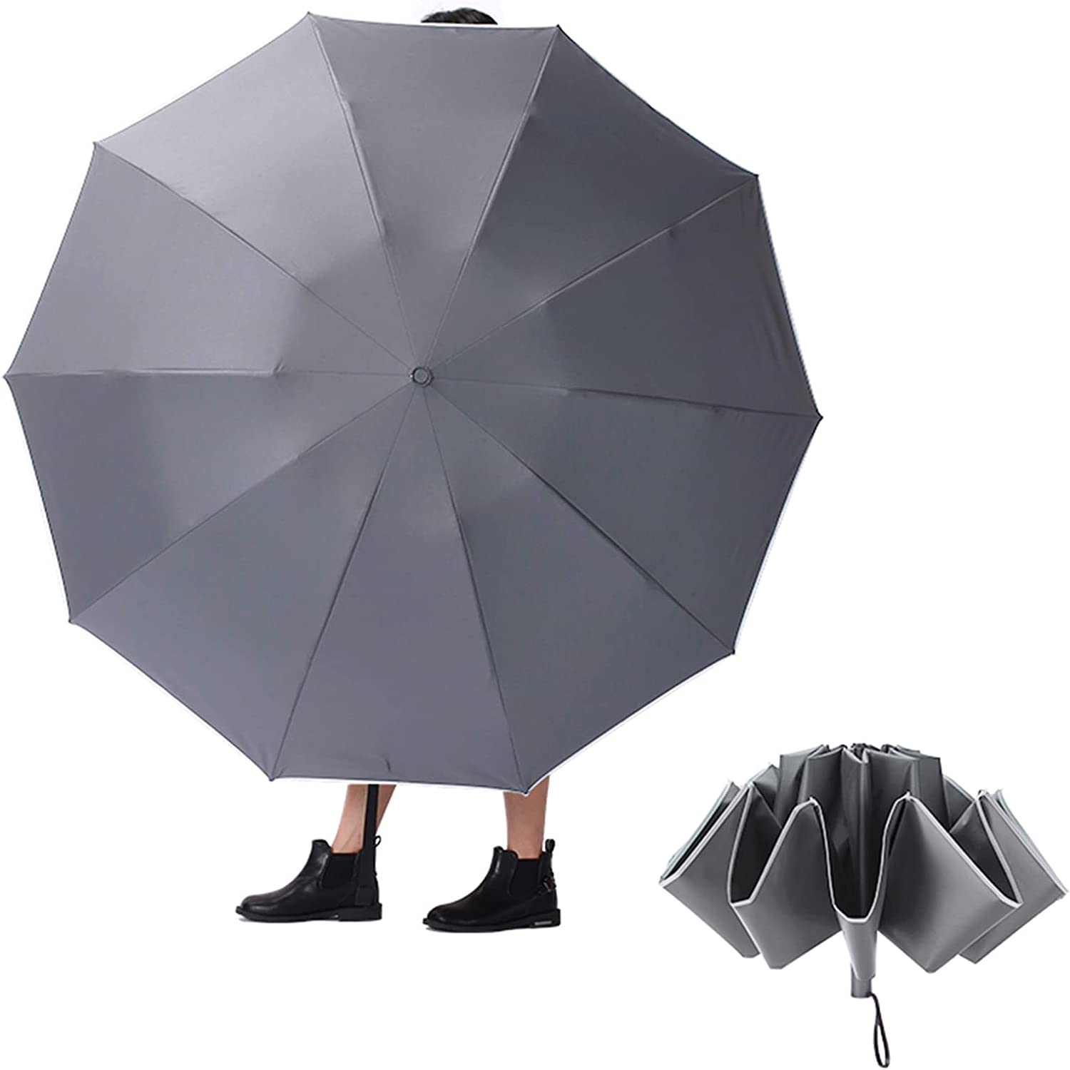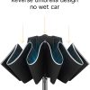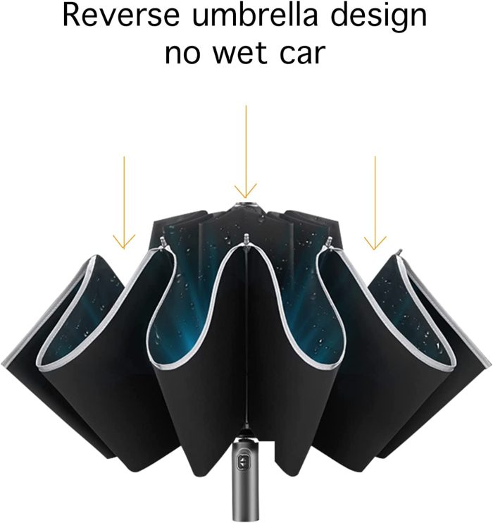 ? [Reverse Folding Umbrella]: This upside down umbrella takes a inside-out design. When close it the wet part will be inside of the umbrella preventing water from dripping and it will not get yourself wet when getting in and out of the car. You don’t even need to worry about this automatic travel umbrella will wet your floor and mat.