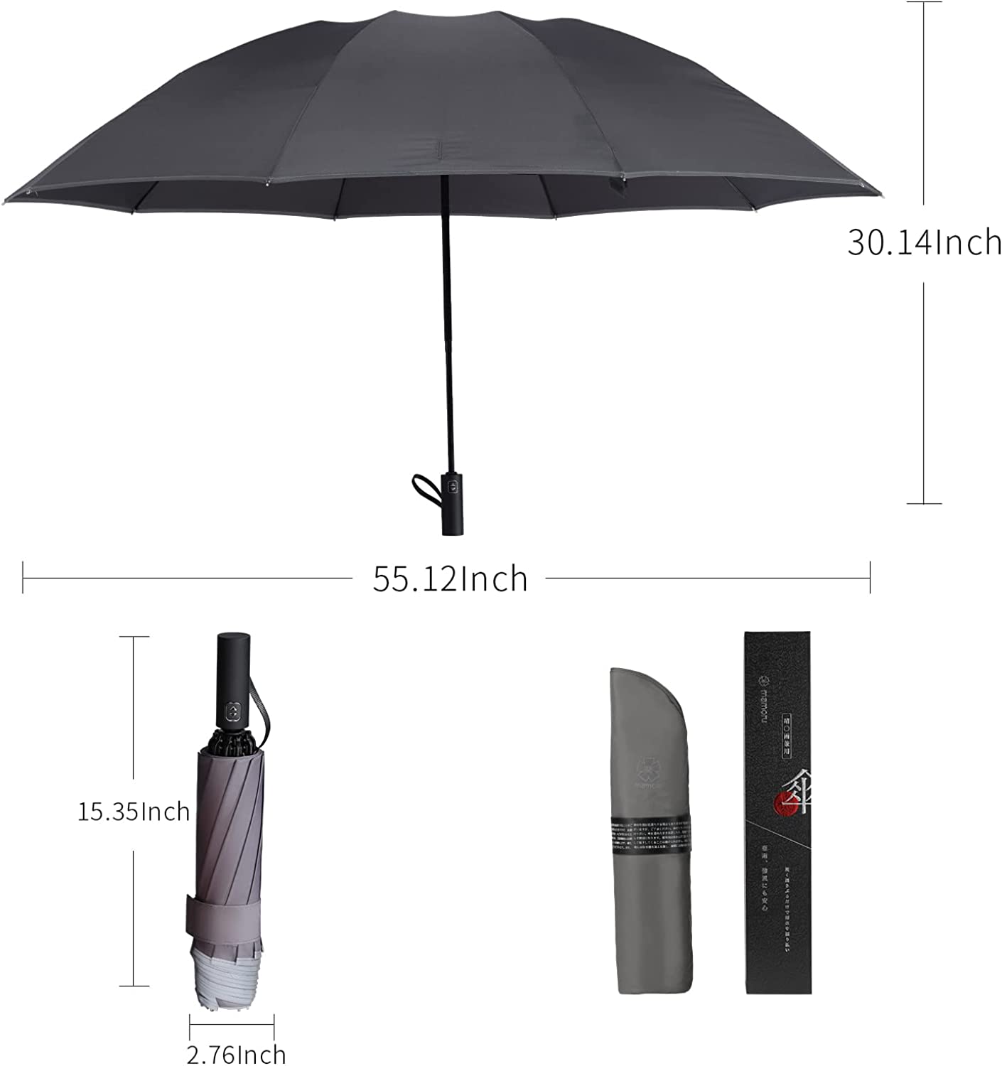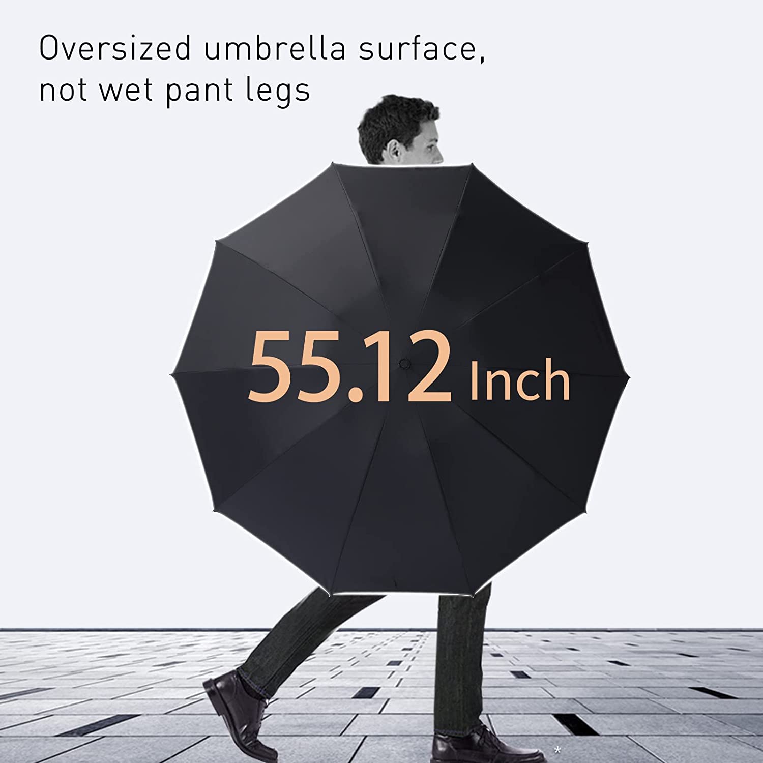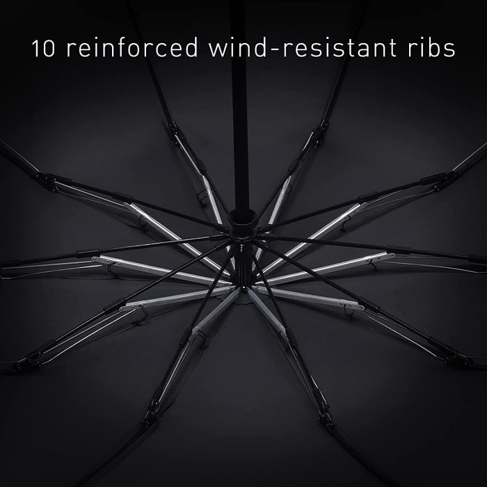 ?[Superior Windproof and Waterproof]: This windproof umbrella is flexiable enough to withstand powerful wind without turning inside out.It is fortified with 10 reinforced aluminum alloy ribs.The cannopy is made of high density 210T waterproof material which makes it good at waterproof function. 55 oversized inches you don’t have to choose between gigantic windproof umbrellas or tiny ones that cannot provide minimal wind protection.
