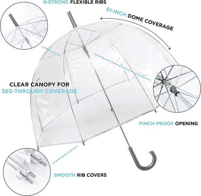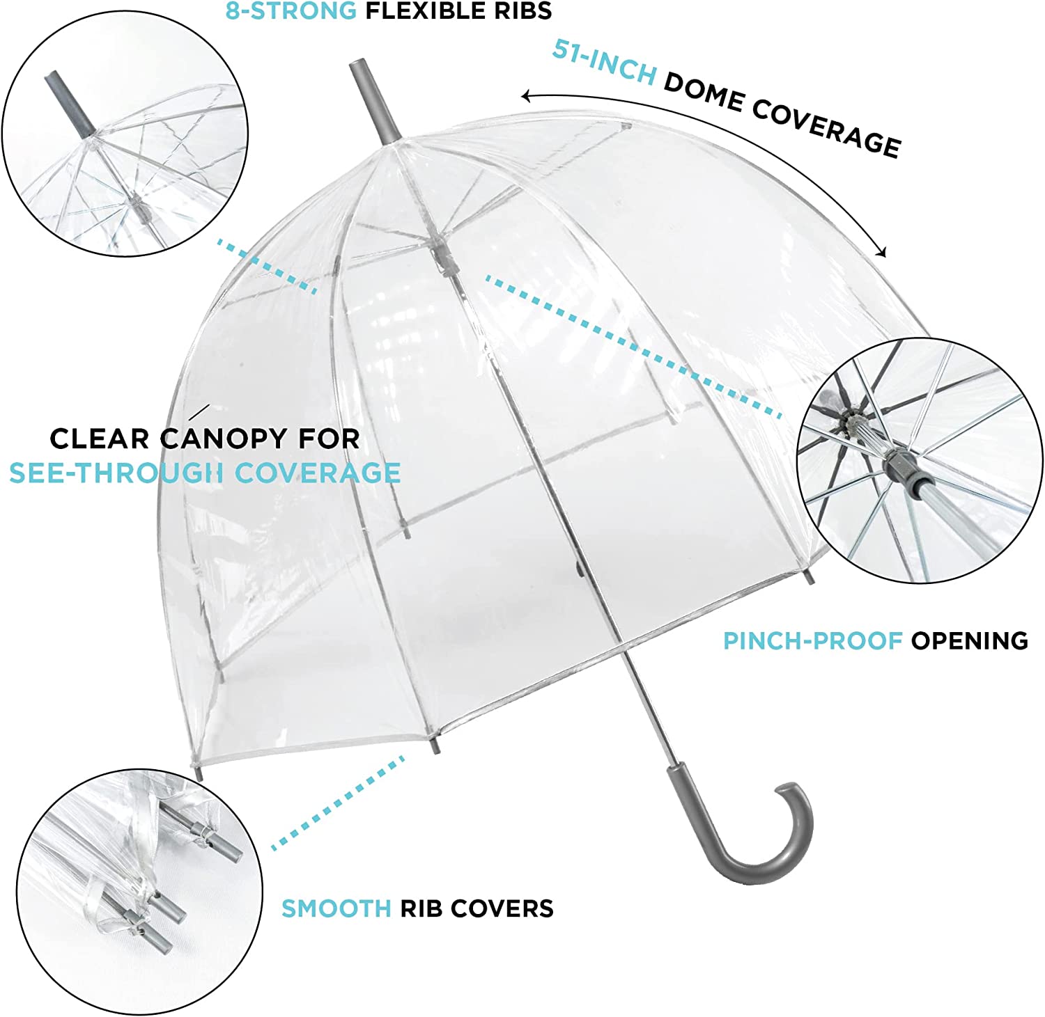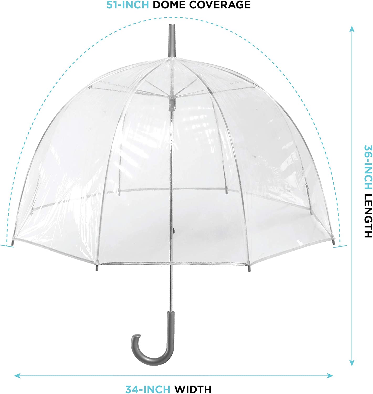 DURABLE CONSTRUCTION: Our umbrellas are made to last; this clear dome umbrella features a steel shaft with a classic curved handle design so your umbrella is easy to carry rain or shine