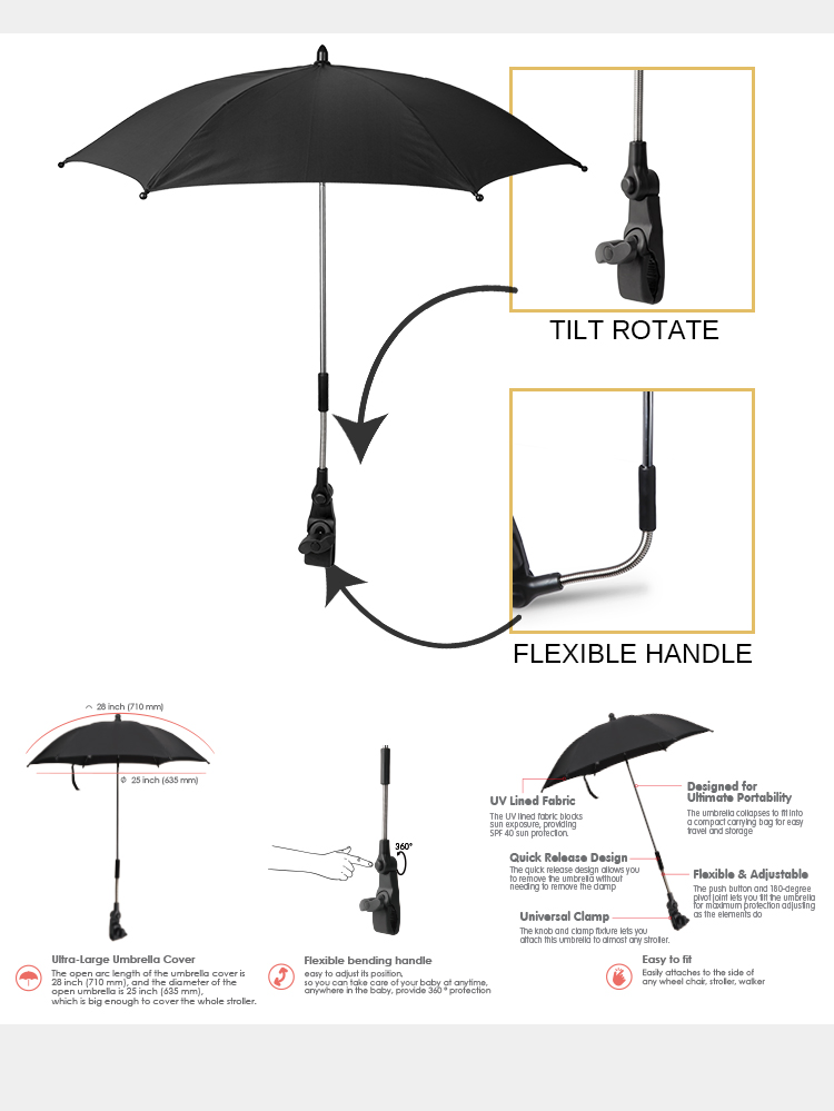 | Name | Black Custom Clip Stroller Accessories Kids Children Pram Shade Holder Strollers Adjustable Baby Stroller Bike Umbrella For Outdoor |