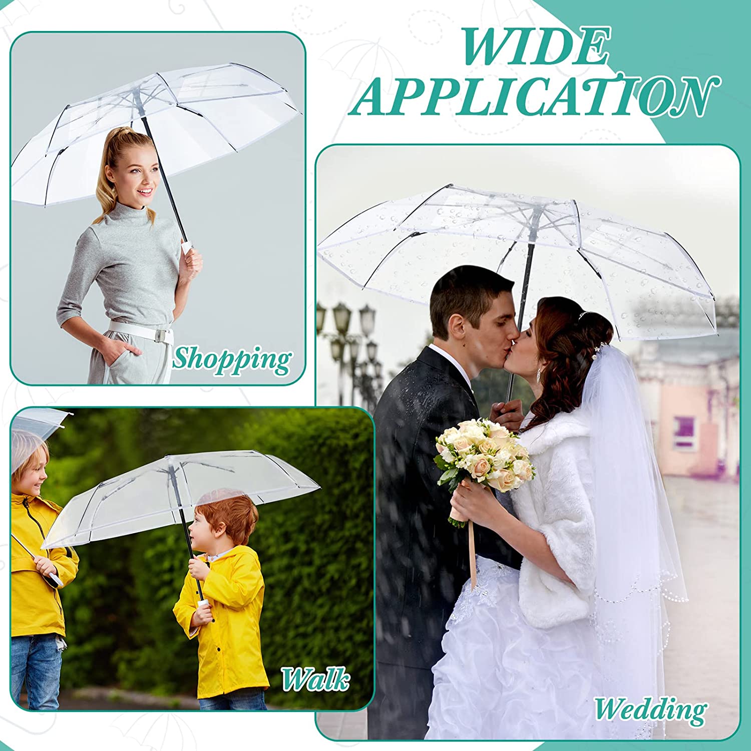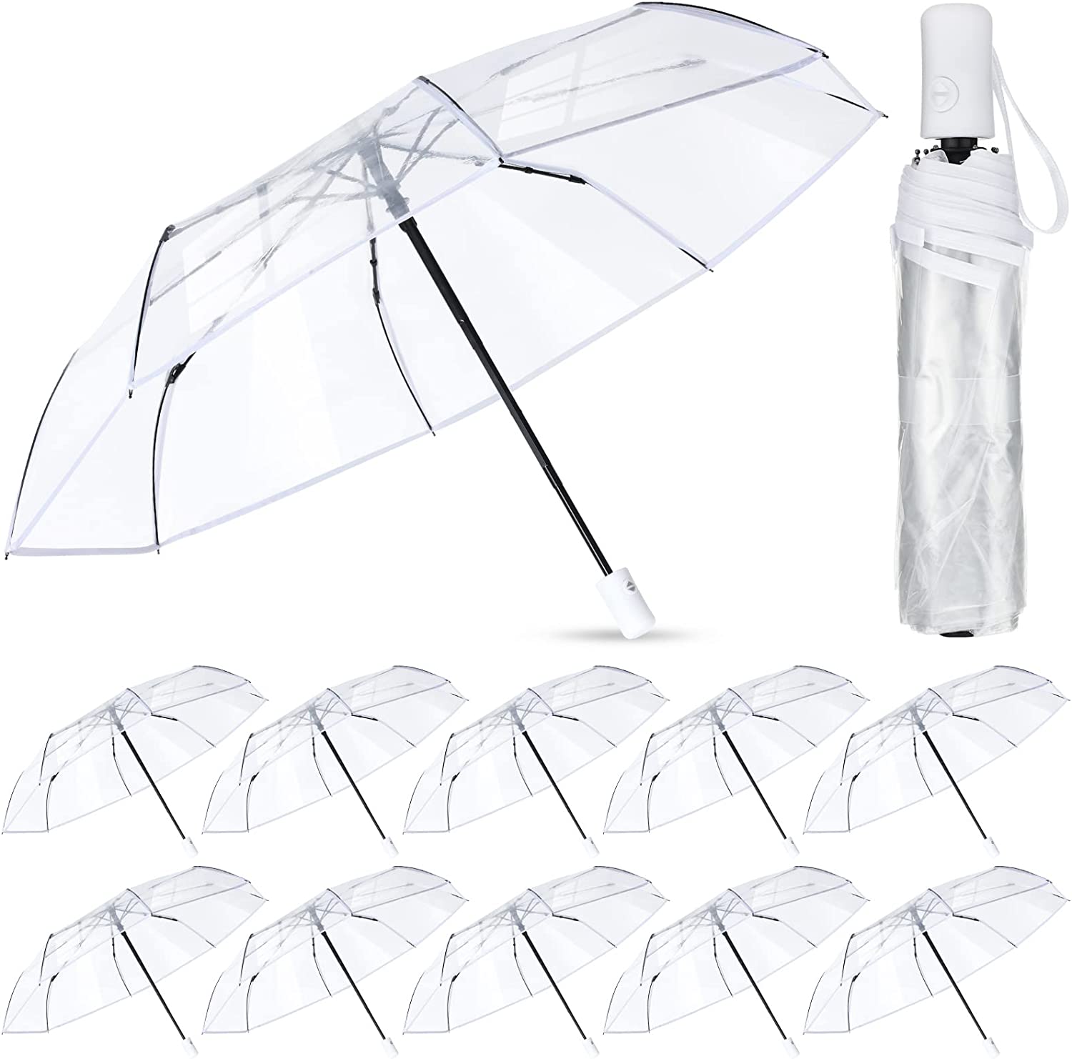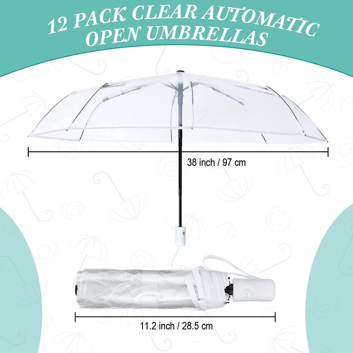 Package Includes: you will get 12 pack clear automatic open umbrellas in white enough for your daily use and replacement needs the clear umbrella opens with a diameter of 38 inches / 97 cm and is large enough to accommodate 2 people; The clear umbrella can be folded to 11.2 inch / 28.5 cm it won’t take up much storage space for you