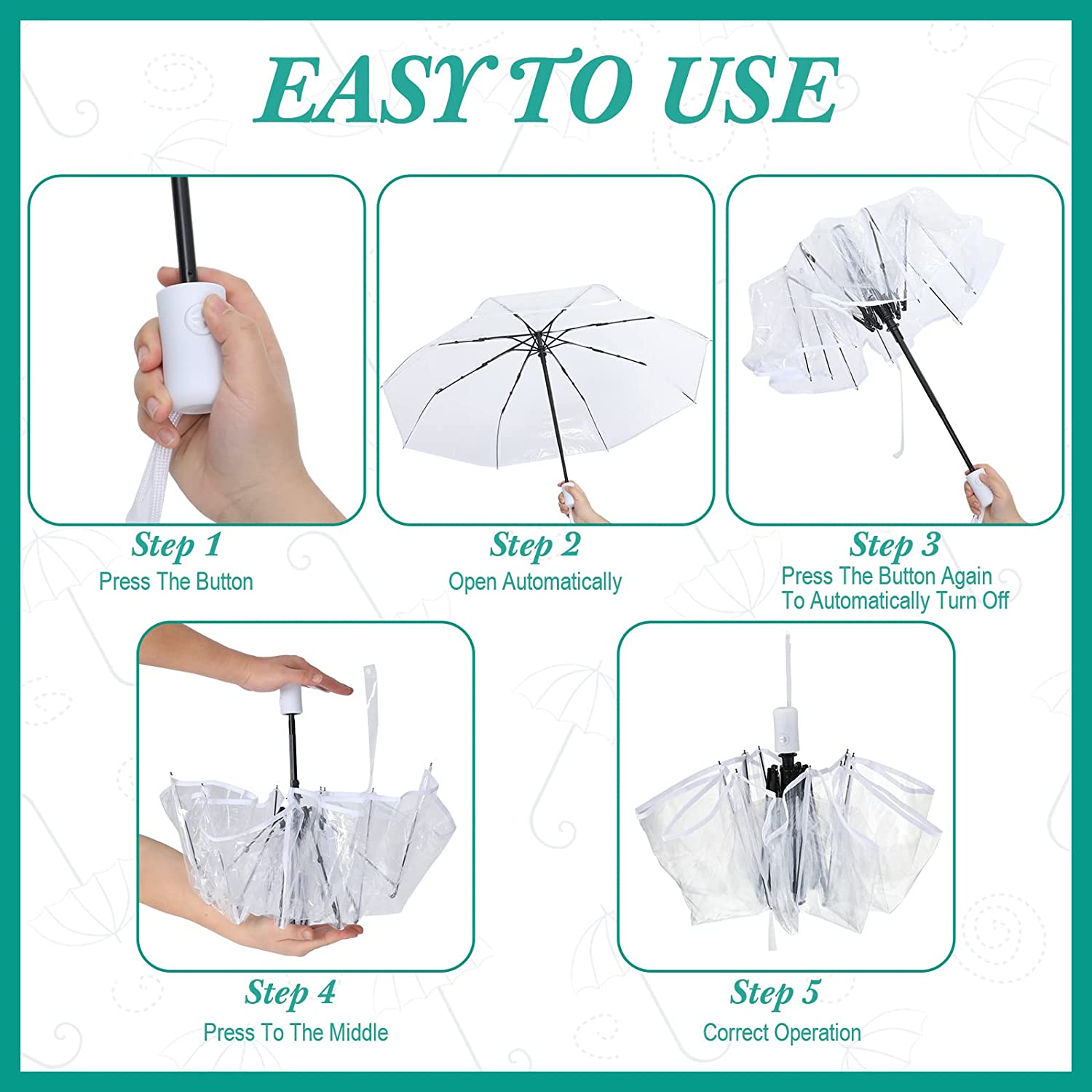 Automatic Open and Close: the auto open close transparent umbrella adopts an automatic opening mechanism for easy one-handed operation just press the button to automatically open and press it again to immediately fold and close; The umbrella adopts 8-ribs design which is strong and sturdy can better support the umbrella cover and won’t break in heavy winds