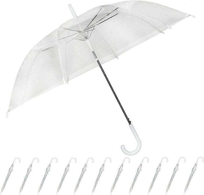 From charming décor to a wedding day must-have the set of 12 crystal clear vinyl umbrellas add a playful touch to any wedding party or event.