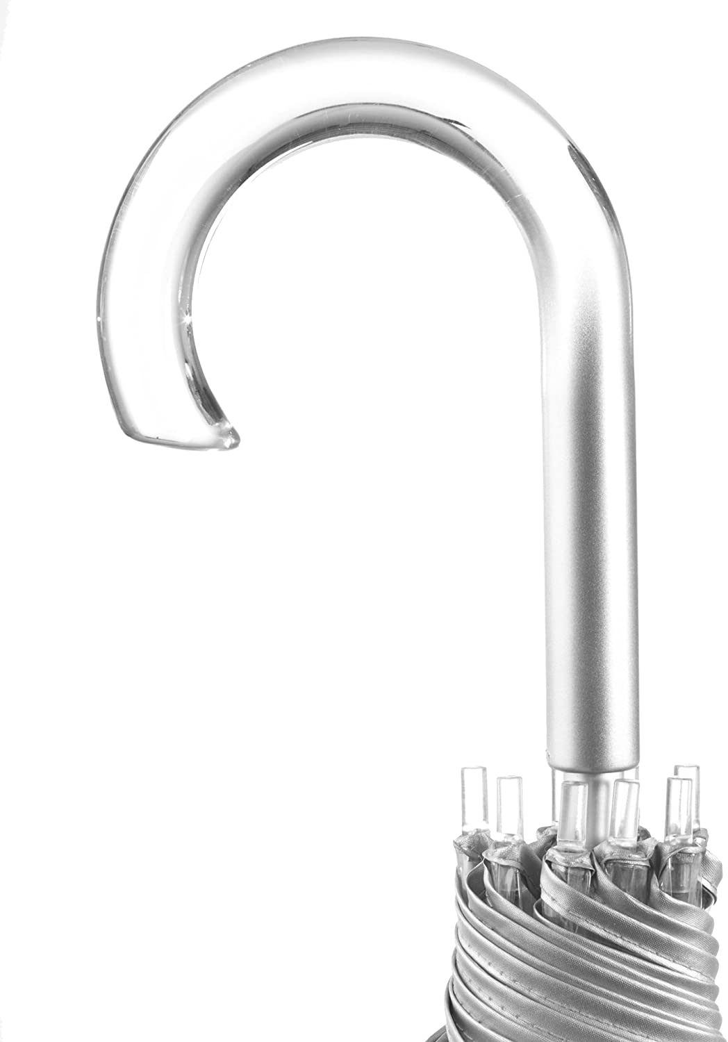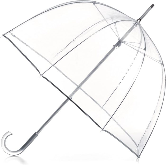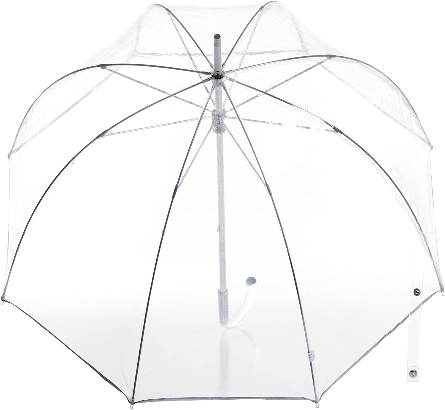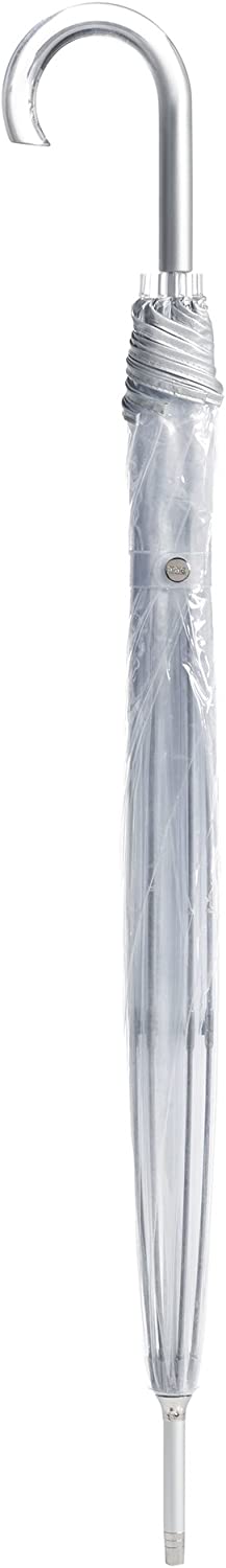 Get a clear view on the world with the Classic Clear Bubble Umbrella by Custom Wedding Umbrellas. This super clear PVC umbrella has a canopy arc of 52 inches open with a generous 17 inches of headroom providing extra rain protection while allowing you to see clearly. Designed with a classic J shaped handle it is easy to carry. The timeless look of this classic style makes this umbrella the perfect gift. You will be able to face any weather and still stay looking great. Please note that when you first open your umbrella you will see a fine powdery film coating the interior of the umbrellas canopy. This has been done intentionally by the manufacturer in order to maintain the integrity of the canopy while the umbrella is being stored in the warehouse. To remove the film simply wipe off the interior with a dry rag and enjoy.
