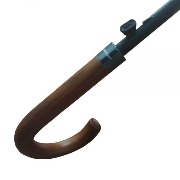 Custom Wooden Handle Umbrella with Branded Logo Printing, Branded Logo Position: Umbrella Canopy, Umbrella Handle, Umbrella Sleeve, Metal Cap. Black Fiberglass Frame with Metal Cap Wooden Handle.