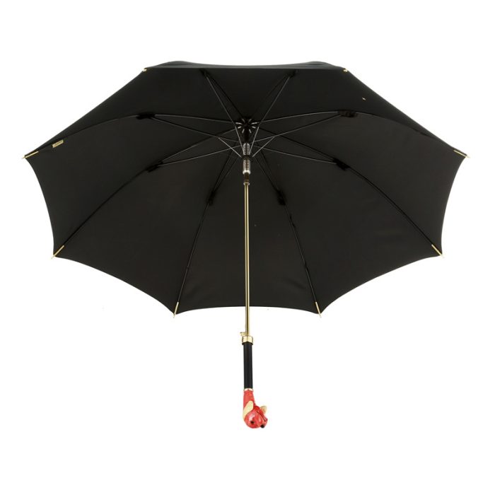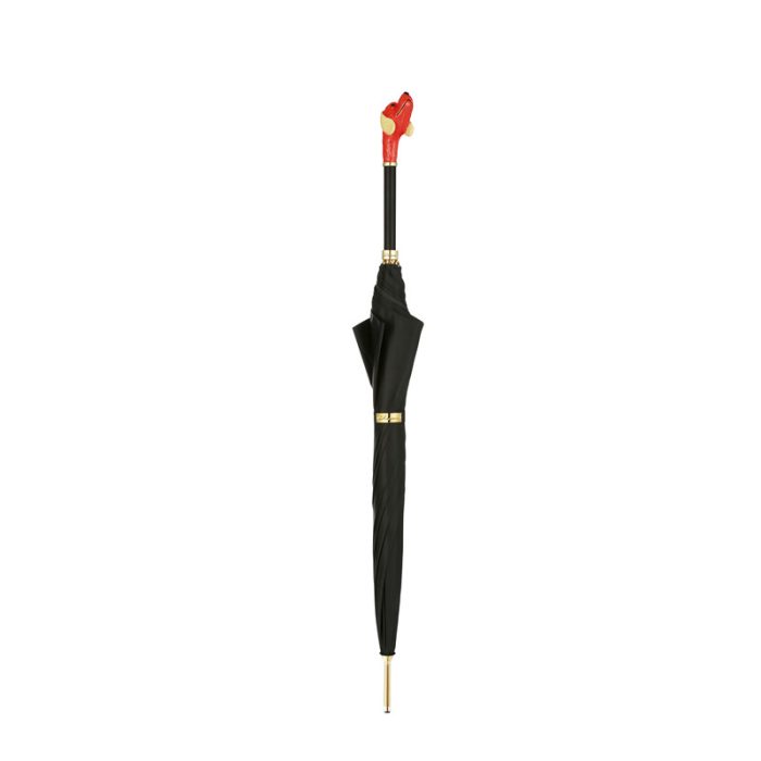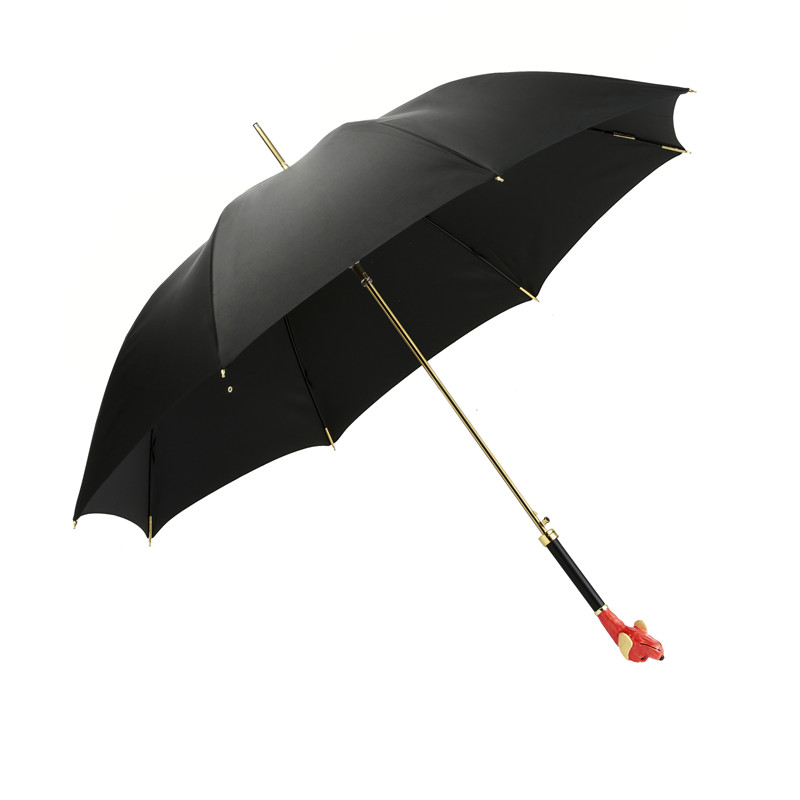Simpler, umbrellas with a logo imprint mainly fall into the category of our stock umbrellas. Stock umbrellas come in a number of styles and sizes and start out fully assembled. We print and ship our stock logo umbrellas within ten days for a fast turnaround. Of course, there are limitations when printing on finished umbrellas. On a stock umbrella, we print in the center of the umbrella panel towards the bottom of the panel. On a finished umbrella, that is the only area of the panel flat enough to place on the printing press. We are not able to print across the seams or in the center of the overall umbrella on a stock umbrella because the ribs will interfere with the print.Labrador dog straight handle umbrella,classic style
