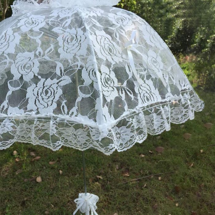 - This item is an elegant real sized laced parasol. Its truly beautifulwith the lace trimming makes it even more special. And its great forwedding bridal party decoration photo props etc. Metal ribs and woodenhandle keep it sturdy enough for the wind. Give you shelter from the sun. But it not suitable be used in rain NOT for rain-proof.