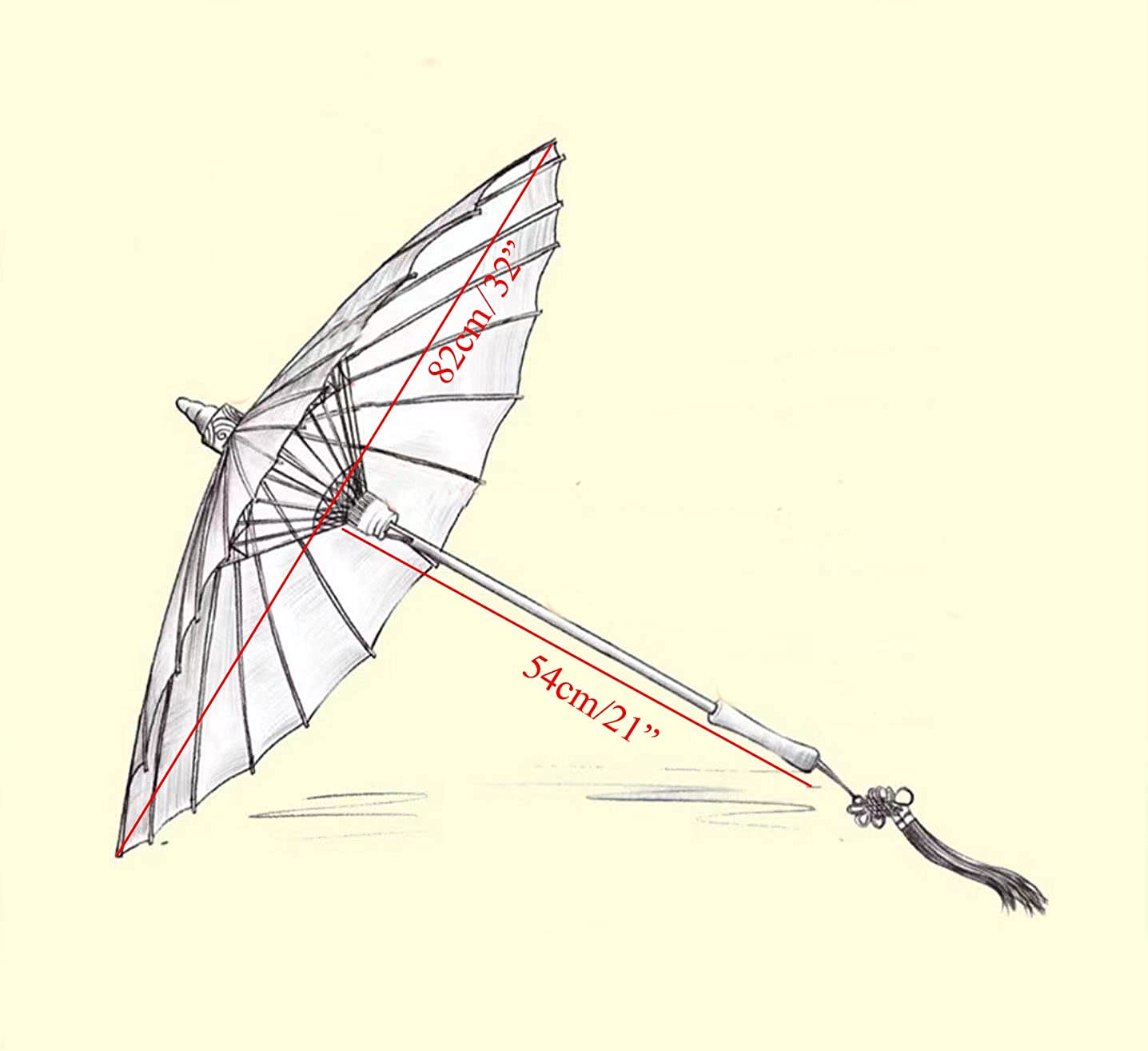 32 Chinese Japanese Umbrella Size:You will get an antique Japanese silk printed umbrella. Its open size is 82*54 cm(32*21 inches). folded size is54*6*5 cm(21*2.3*1.9 inches).Weight is 0.3 kg (0.66 lb).Perfect for children over 10 years old and adults.