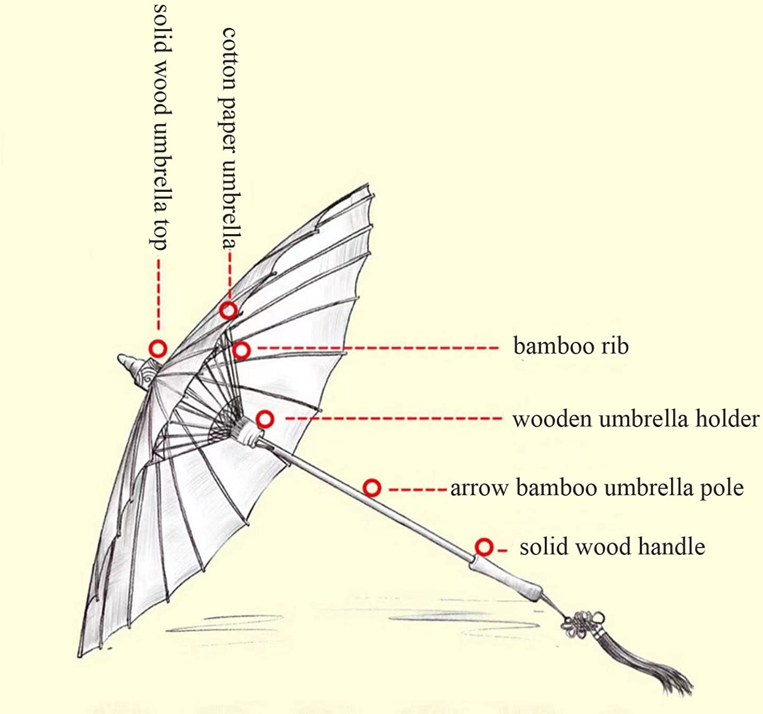 Handmade Parasol Umbrella Material:Our Umbrella made of silk fabrics first-class bamboo ribs.the Umbrella is durable and elegant doesn’t rip as easily as a paper folding fan. With safe and harmless bamboo frame and oak handle.you can feel the unvarnished sense which is differ from plastic one.While blocking the sun it gives you an elegant and luxurious temperament!