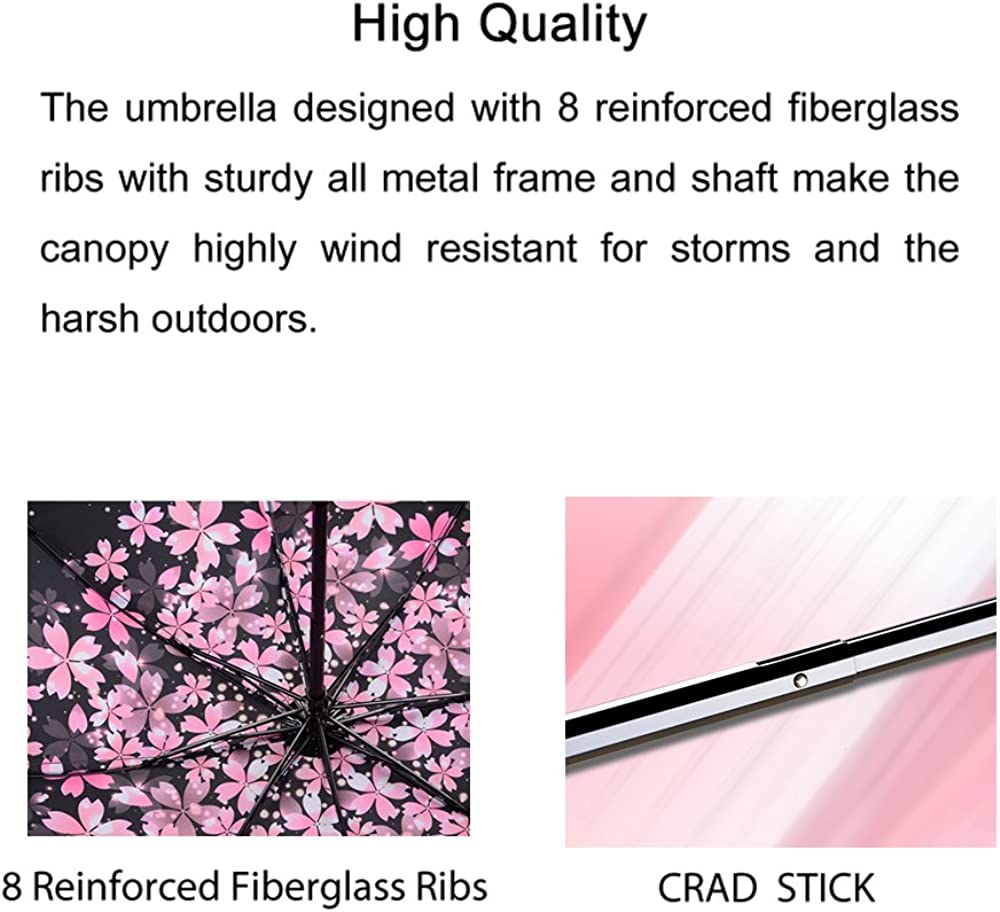 PERFECT SIZE:The travel umbrella less than 10in long and weighing just 0.7 lb is extremely packable in purses briefcases backpacks luggage etc.compact and lightweight. HIGH QUALITY:The umbrellas designed with 8 reinforced fiberglass ribs with sturdy all metal frame and shaft make the canopy highly wind resistant for storms and the harsh outdoors. OVERSIZE CANOPY:The canopy uses resistant pongee micro-weave fabric.This material is lightweight quick drying waterproof anti-uv protection. Package:1x Umbrella 1x Umbrella Cover. Guarantee:The folding handheld umbrella is perfect gift for parents children friends colleagues etc.We are dedicated to customer satisfaction if for any reason you’re not happy with your purchase you will receive a full refund or replacement guaranteed.