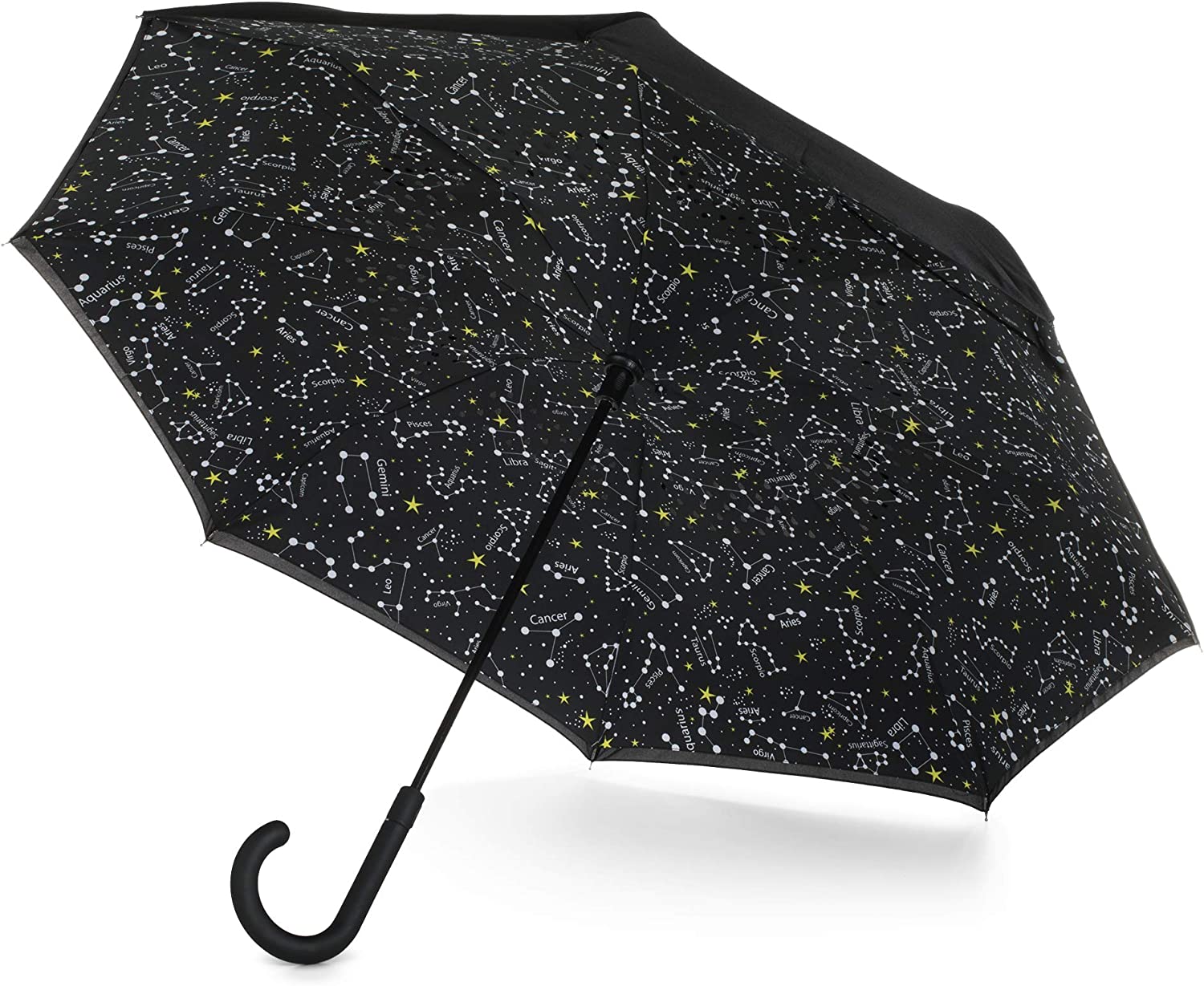 Folds in. Keeps drips away. Don’t let ordinary folding umbrellas and their drippy messes win! Stay on the dry side with our smartly designed InBrella…where innovation meets style. This extraordinary umbrella closes inside out keeping water away from you. The auto close feature makes folding the umbrella a breeze with the press of a button; no more annoying wet clothes on trips in andout of the car. Once closed the InBrella stands upright on its own so you don’t have to worry about what to do with it when you don’t need it. And the quirky under-canopy prints will bring a permanent smile to your face on those dreary days.
