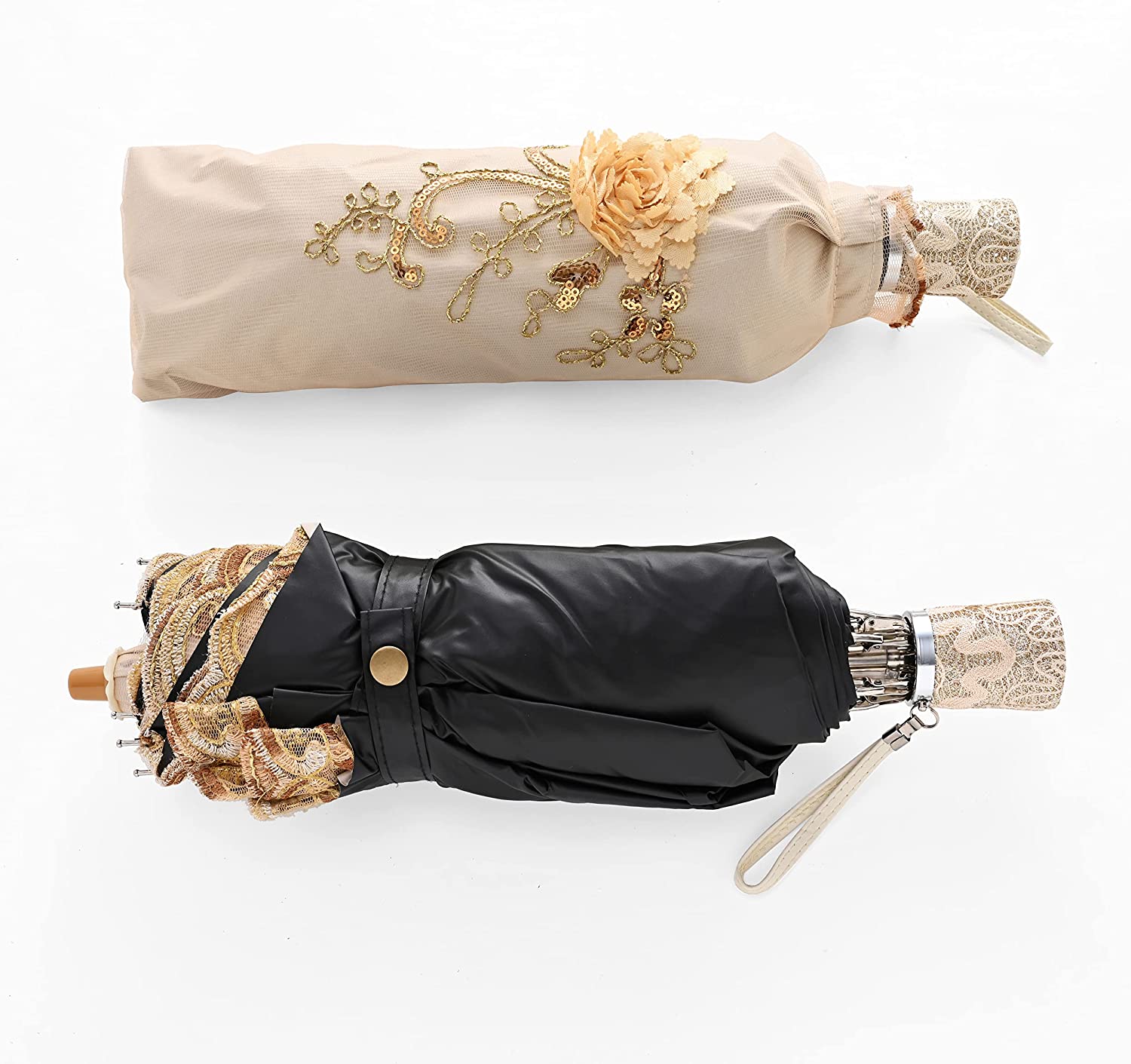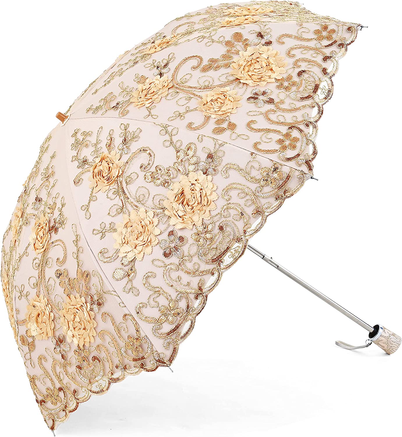 Design: Double-layer material. The inner layer is made of vinyl and the outer layer is lace with embroidered floral patterns and sequins. When opened in the sunlight it emits a dazzling glow. Umbrella ribs are highly plastic and the umbrella can be folded into two layers.