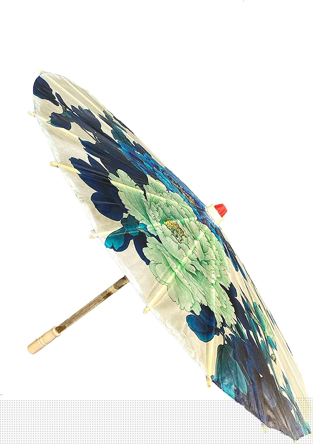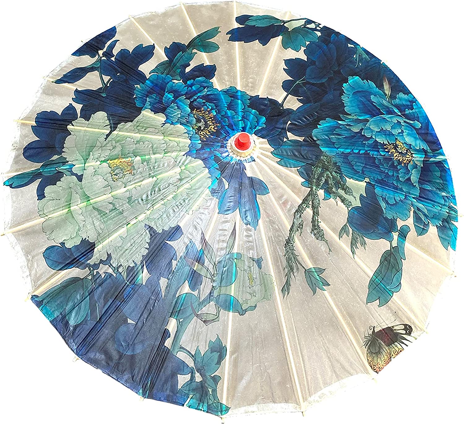 A beautiful parasol featuring traditional Chinese art. Shows a beautiful cluster of blue peonies with a butterfly in the corner