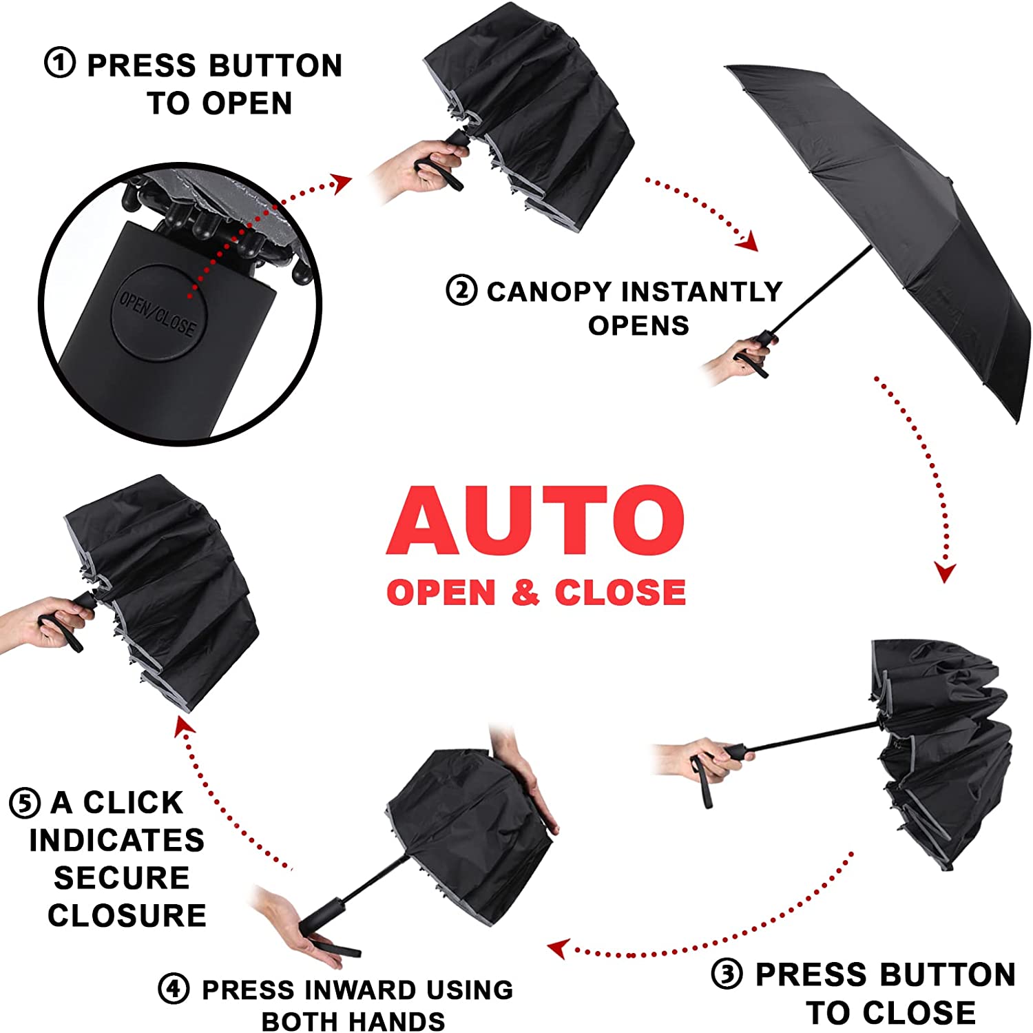 ??Automatic Open & Close: you can just press a button on the handle to open and close our compact umbrella