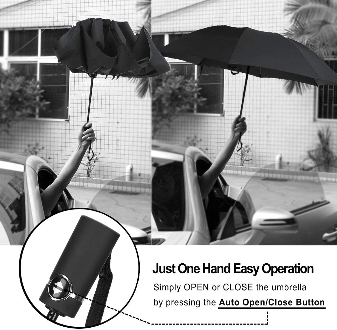 CONVENIENT AUTO OPEN/CLOSE IN ONE SECOND: Just push the button once to automatically open and press again to instantly fold the canopy closed. You do not need to wait another second to open the umbrella when you get out of your car in the rain especially in heavy rainfall even when your hands are full of things.